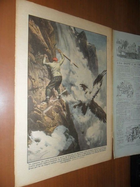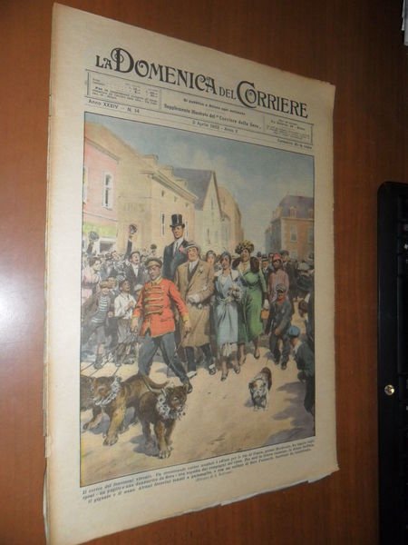 DESCRIZIONE: Domenica del Corriere, Milano, Anno XXXIV n. 14 (3 Aprile 1932-X). COPERTINA: "Il corteo dei fenomeni viventi. Un eccezionale corteo nuziale è sfilato per le vie di Cenon, presso Bordeaux. La coppia degli sposi - un pugile e una danzatrice da fiera - era seguita dai compagni del circo. Tra essi la donna cannone, la donna barbuta, il gigante e il nano. Alcuni leoncini tenuti a guinzaglio, e con un collare di fiori d'arancio, facevano da battistrada." (dis. W. Molino) RETRO: "Un alpinista che stava scalando la parete meridionale del Murolungo, nelle montagne abruzzesi del Velino, veniva assalito improvvisamente da un'aquila. Il giovane si difese a colpi di piccozza; ma la lotta avrebbe avuto per lui un tragico epilogo, se una valanghetta di neve non si fosse abbattuta con violenza sul rapace, travolgendolo." (dis. W. Molino) CONDIZIONI: Ottime. Con spille e sovraccoperta. PESO / WEIGHT: 100 gr. without package