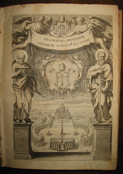 4to (cm. 21,5), XVI-162 pp., 1 c.nn. bianca. Antiporta incisa su rame e vignetta al frontespizio. Alcune ill.ni n.t. (di cui 4 a piena pagina), capilettera, testatine e finalini. In fine, una grande pianta della Basilica Vaticana più volte ripiegata. Frontis. stampato in rosso nero. Legatura coeva in pergamena rigida con titolo ms. al ds. (poco leggibile). Tagli colorati. Un taglio ed una piccola lacuna risarcita sulla grande tavola finale, altrimenti esemplare in ottimo stato di conservazione. Opera rara. Rossetti (n. 9388) non menziona la pianta fuori testo della Basilica di S.Pietro.