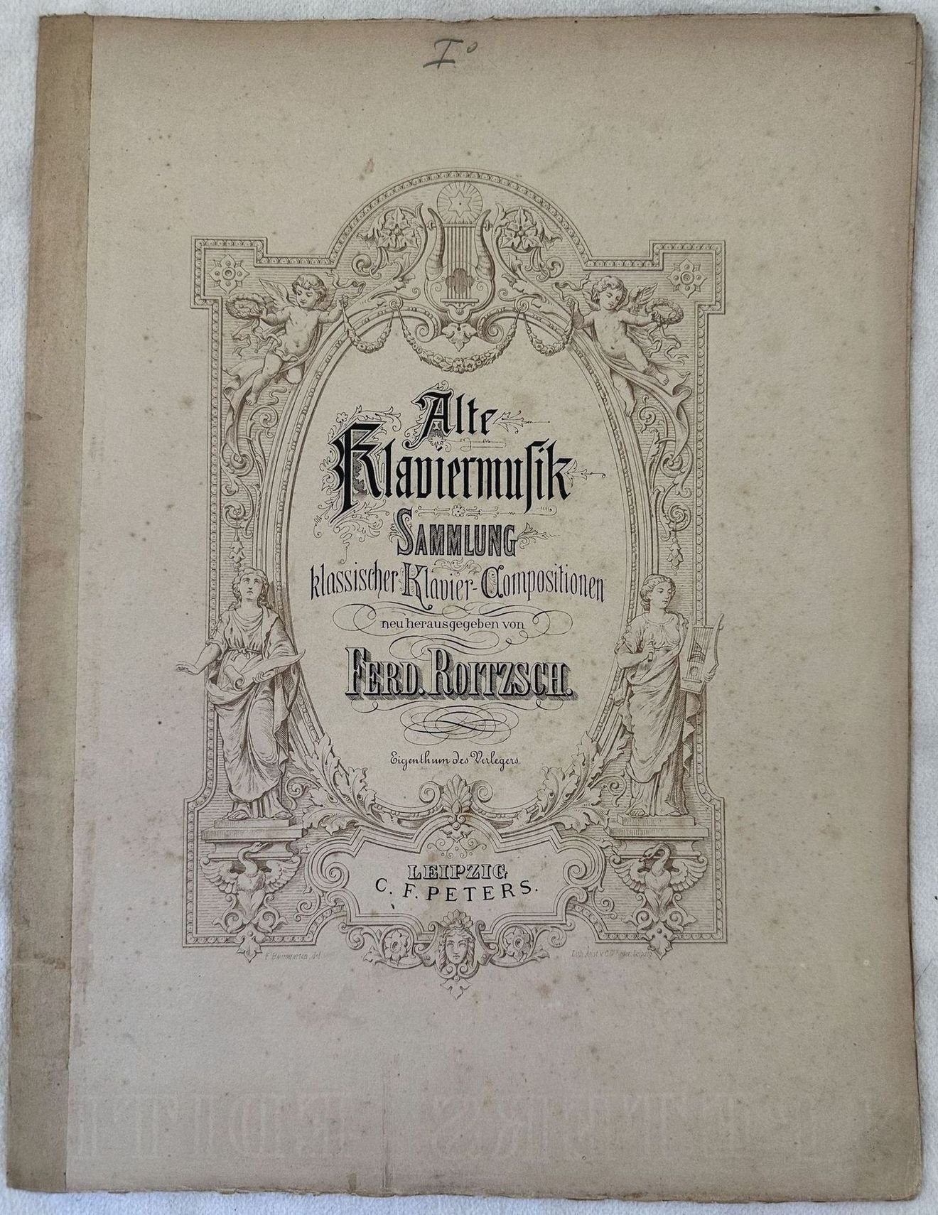 Edizione della fine dell'ottocento o primi del novecento di questa raccolta di pezzi di vari compositori rivisti per pianoforte da Ferd. Roitzsch. All'interno: Joh. Ernst Bach, J. Ph. Kirnberger, Ph. Em. Bach. F. Couperin, Ph. Rameau, Domenico Scarlatti. In buone condizioni. Copertina editoriale in ottime condizioni con lievi usure marginali. Dorso coperto da carta. Legatura in buone condizioni. Pagine in buone condizioni con rare fioriture. In Folio. cm. 31x23,5. Pp. 27.Edition of late 19th century or early 20th century of this collection of french popular pieces of different composers reviewed for piano by Ferd. Roitzsch. Inside: Joh. Ernst Bach, J. Ph. Kirnberger, Ph. Em. Bach. F. couperin, Ph. Rameau, Domenico Scarlatti. In good conditions. Editorial cover in very good conditions lightly worn in the extremities. Spien covered by paper. Binding in good conditions. Pages in good conditions with occasional foxing. In Folio. cm. 31x23,5. Pp. 27.