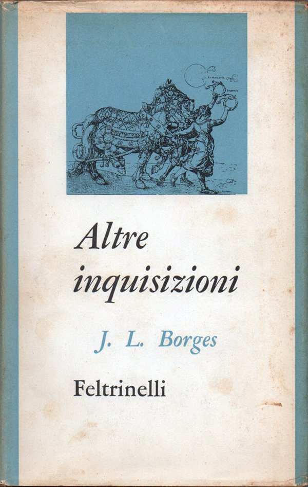 In-16° (19,5 x 12,1 cm), pp. 282, (2), legatura editoriale con sovraccoperta. Alcuni segni d'uso e del tempo alla sovraccoperta, in particolare, qualche piccola, leggera traccia d'umido nella parte che ricopre il piatto anteriore e parte che ricopre il dorso che presenta una colorazione leggermente più chiara rispetto a quella, in origine la medesima, delle cornici laterali delle parti che ricoprono i piatti, probabilmente a causa dell'esposizione alla luce. Qualche lieve segno d'umido alla carta di guardia posteriore. Patina del tempo alle pagine, con arrossature ai margini dovute al tipo di carta; per il resto ben conservato. Titolo dell'opera originale: Otras Inquisiciones. Traduzione dallo spagnolo di Francesco Tentori Montalto. Volume 21 nella collezione "I Classici Moderni", biblioteca di letteratura diretta da Giorgio Bassani. Prima edizione italiana.