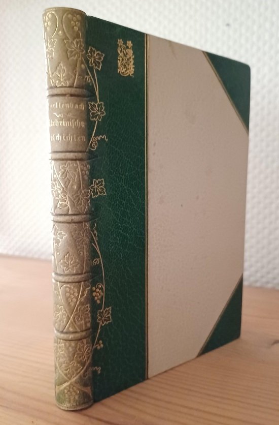 - Halbledereinband (signierter Handeinband) mit Lederecken, goldgeprägtem verziertem Rückentitel auf 5 Zierbünden, Vorsätze mit marmoriertem Handpapierbezug, illustriertem, auf Pergament gedrucktem Vortitel , Kopfgoldschnitt und Signet-Stempel des Buchbinders (H. & C. Schultze, Düsseldorf).