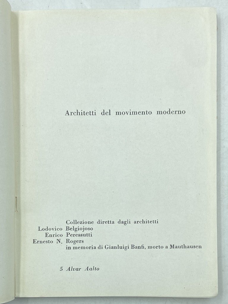 Brossura editoriale a stampa, cm 17 x 12, pp 155 (3); numerose tavole e illustrazioni in nero anche su doppia pagina. Buono stato, lievi segni del tempo sulla brossura. Quinto titolo dell’importante collana Architetti del movimento moderno, diretta da Lodovico Belgiojoso, Enrico Peressutti ed Ernesto Nathan Rogers in memoria di Gianluigi Banfi morto a Mathausen. Il testo, precoce analisi dell'opera dell'architetto finlandese, fu preparato da Giorgio Labò come serie di articoli che Giuseppe Pagano avrebbe dovuto pubblicare nel 1941 su Casabella; l'autore, giovane studente di Architettura, si unì alla lotta partigiana e fu fucilato dai tedeschi nel 1944 senza vedere pubblicato il saggio, qui proposto senza ritocchi con solo aggiornamento bibliografico curato dal padre Mario. Prima edizione.