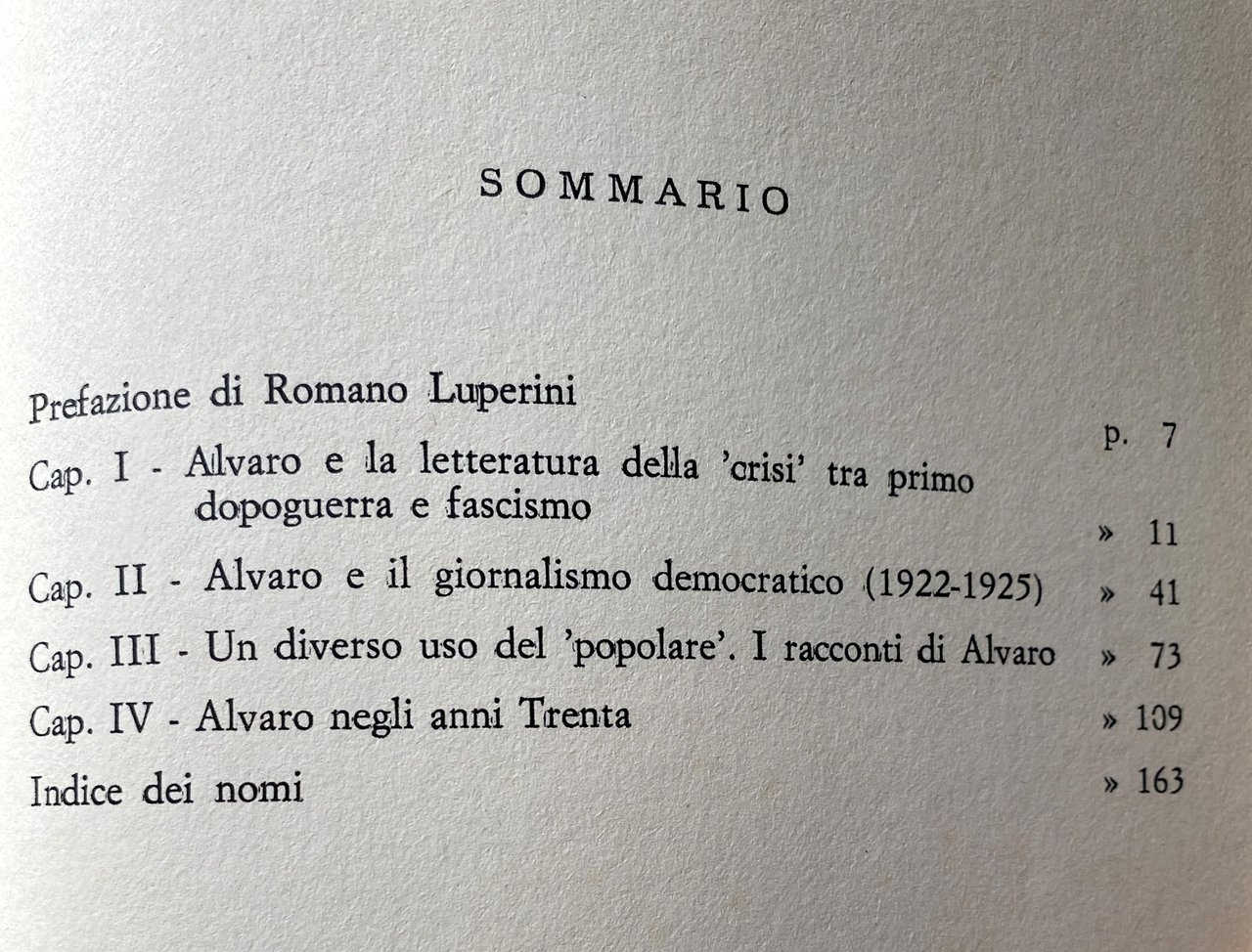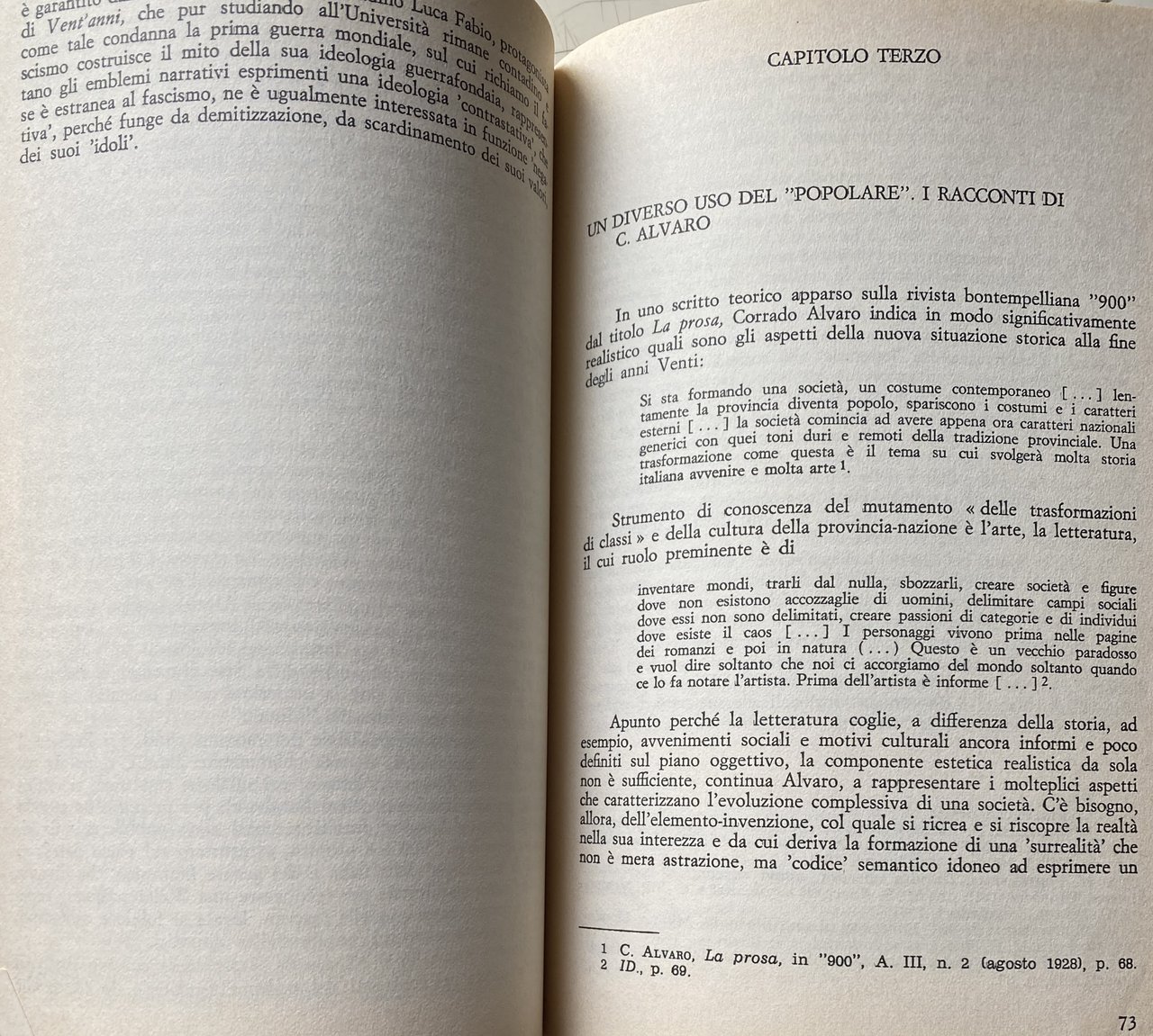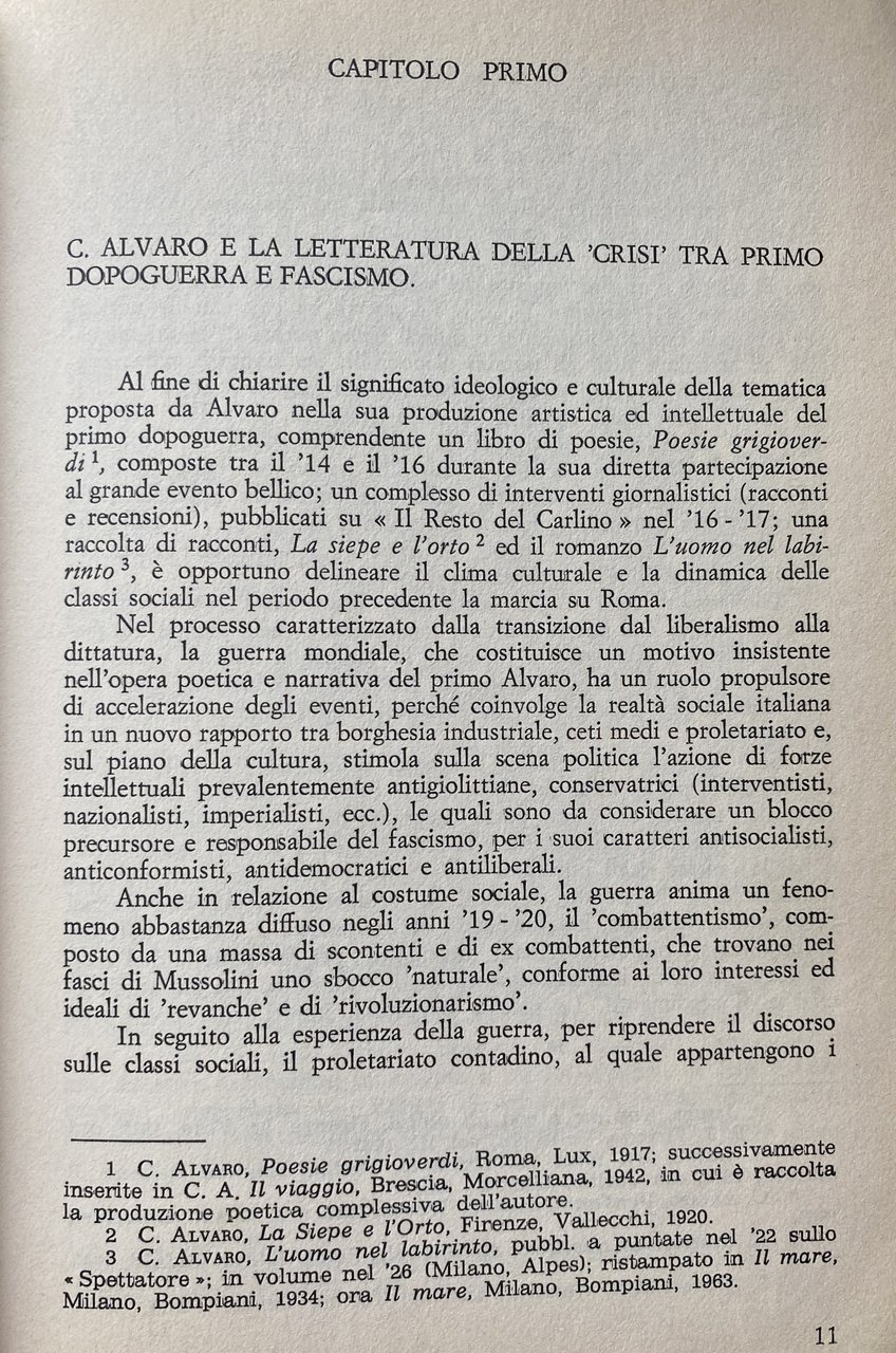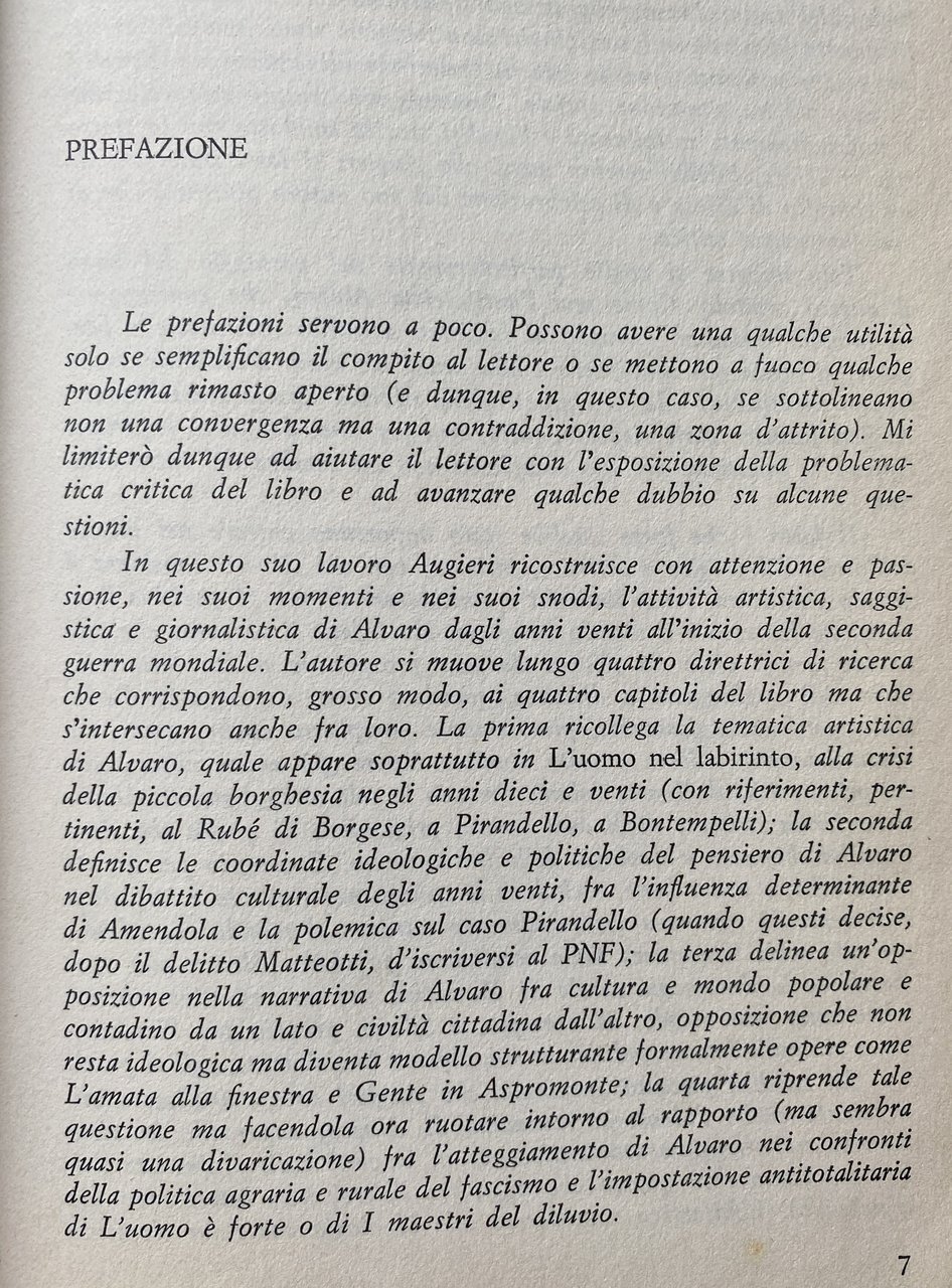 PREFAZIONE. Le prefazioni servono a poco. Possono avere una qualche utilità solo se semplificano il compito al lettore o se mettono a fuoco qualche problema rimasto aperto (e dunque, in questo caso, se sottolineano non una convergenza ma una contraddizione, una zona d'attrito). Mi limiterò dunque ad aiutare il lettore con l'esposizione della problematica critica del libro e ad avanzare qualche dubbio su alcune questioni. In questo suo lavoro Augieri ricostruisce con attenzione e passione, nei suoi momenti e nei suoi snodi, l'attività artistica, saggistica e giornalistica di Alvaro dagli anni venti all'inizio della seconda guerra mondiale. L'autore si muove lungo quattro direttrici di ricerca che corrispondono, grosso modo, ai quattro capitoli del libro ma che s'intersecano anche fra loro. La prima ricollega la tematica artistica di Alvaro, quale appare soprattutto in L'uomo nel labirinto, alla crisi della piccola borghesia negli anni dieci e venti (con riferimenti, pertinenti, al Rubé di Borgese, a Pirandello, a Bontempelli); la seconda definisce le coordinate ideologiche e politiche del pensiero di Alvaro nel dibattito culturale degli anni venti, fra l'influenza determinante di Amendola e la polemica sul caso Pirandello (quando questi decise, dopo il delitto Matteotti, d'iscriversi al PNF); la terza delinea un'opposizione nella narrativa di Alvaro fra cultura e mondo popolare e contadino da un lato e civiltà cittadina dall'altro, opposizione che non resta ideologica ma diventa modello strutturante formalmente opere come L'amata alla finestra e Gente in Aspromonte; la quarta riprende tale questione ma facendola ora ruotare intorno al rapporto (ma sembra quasi una divaricazione) fra l'atteggiamento di Alvaro nei confronti della politica agraria e rurale del fascismo e l'impostazione antitotalitaria di L'uomo è forte o di I maestri del diluvio.