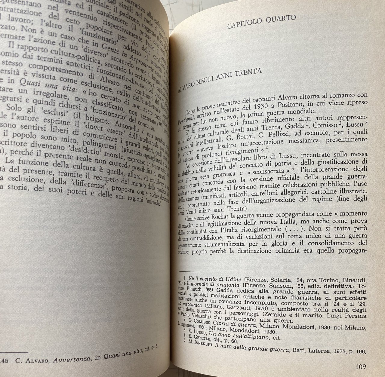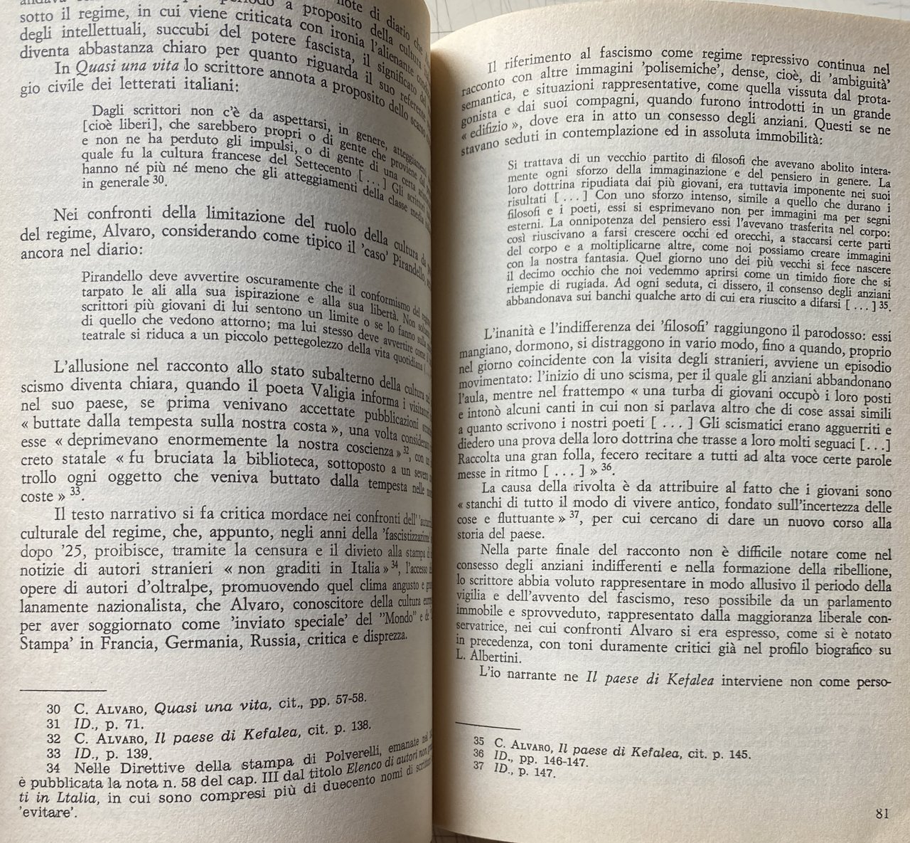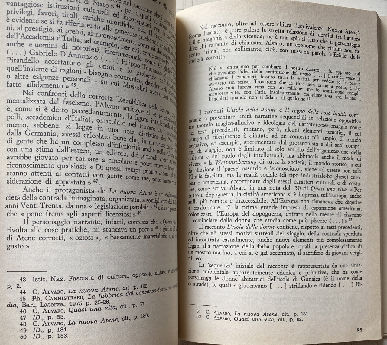 PREFAZIONE. Le prefazioni servono a poco. Possono avere una qualche utilità solo se semplificano il compito al lettore o se mettono a fuoco qualche problema rimasto aperto (e dunque, in questo caso, se sottolineano non una convergenza ma una contraddizione, una zona d'attrito). Mi limiterò dunque ad aiutare il lettore con l'esposizione della problematica critica del libro e ad avanzare qualche dubbio su alcune questioni. In questo suo lavoro Augieri ricostruisce con attenzione e passione, nei suoi momenti e nei suoi snodi, l'attività artistica, saggistica e giornalistica di Alvaro dagli anni venti all'inizio della seconda guerra mondiale. L'autore si muove lungo quattro direttrici di ricerca che corrispondono, grosso modo, ai quattro capitoli del libro ma che s'intersecano anche fra loro. La prima ricollega la tematica artistica di Alvaro, quale appare soprattutto in L'uomo nel labirinto, alla crisi della piccola borghesia negli anni dieci e venti (con riferimenti, pertinenti, al Rubé di Borgese, a Pirandello, a Bontempelli); la seconda definisce le coordinate ideologiche e politiche del pensiero di Alvaro nel dibattito culturale degli anni venti, fra l'influenza determinante di Amendola e la polemica sul caso Pirandello (quando questi decise, dopo il delitto Matteotti, d'iscriversi al PNF); la terza delinea un'opposizione nella narrativa di Alvaro fra cultura e mondo popolare e contadino da un lato e civiltà cittadina dall'altro, opposizione che non resta ideologica ma diventa modello strutturante formalmente opere come L'amata alla finestra e Gente in Aspromonte; la quarta riprende tale questione ma facendola ora ruotare intorno al rapporto (ma sembra quasi una divaricazione) fra l'atteggiamento di Alvaro nei confronti della politica agraria e rurale del fascismo e l'impostazione antitotalitaria di L'uomo è forte o di I maestri del diluvio.