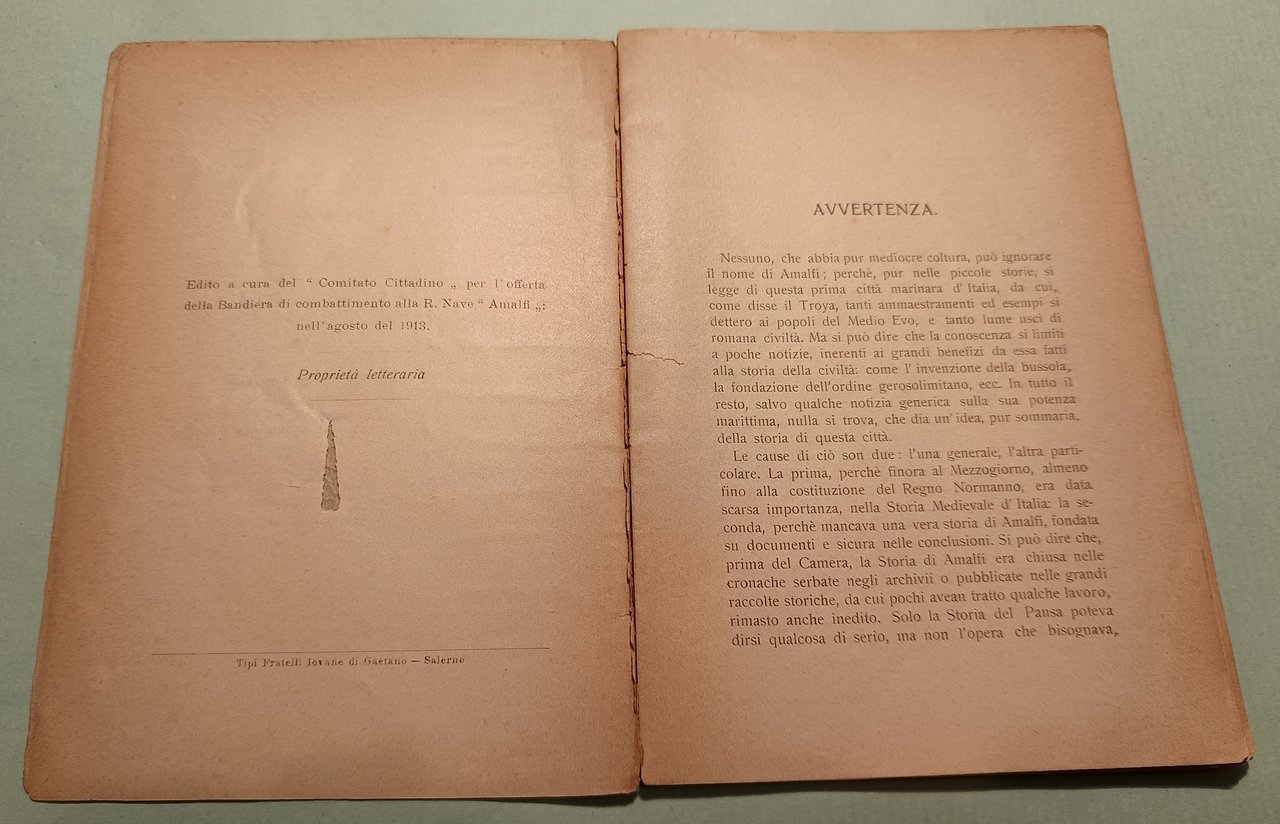 Edito a cura del “Comitato Cittadino” per l’offerta della Bandiera di combattimento alla R. Nave “Amalfi” nell’agosto del 1913. Salerno, Tipi Fratelli Jovane di Gaetano, s.a. In 16mo; pp.50. Cart. edit.