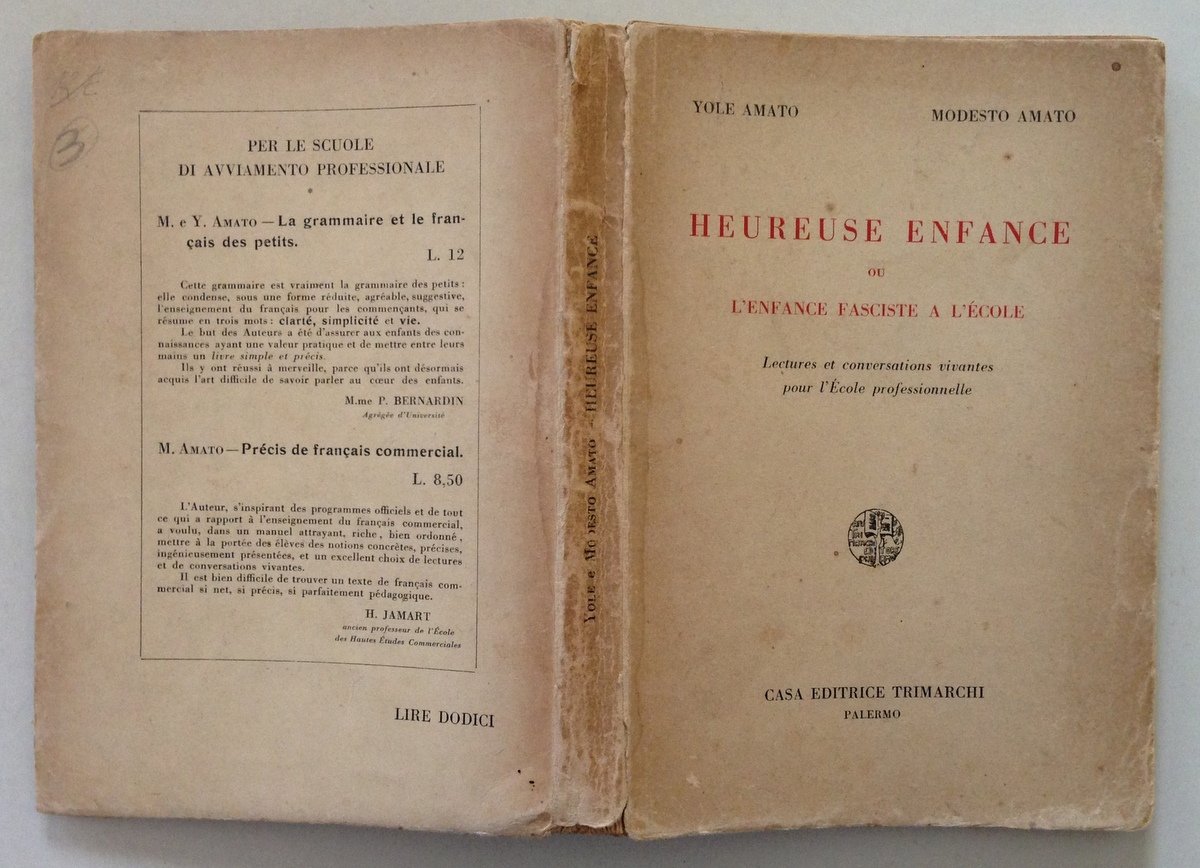 Y. Amato, M. Amato, Heureuse enfance ou l'enfance fasciste a l'école Casa Editrice Trimarchi, Palermo 1937; cm. 20x14, pp. 272; con disegni in b/n di G. Carpintieri; br. ed., testo in lingua francese. Condizioni di conservazione Esemplare in buono stato con leggere tracce d'uso; brossura editoriale con minime abrasioni e pieghette; dorso con minimi strappetti e con minime mancanze alle cuffie; interni leggermente bruniti, qualche fascicolo leggermente allentato. SETT142.L14173 MT