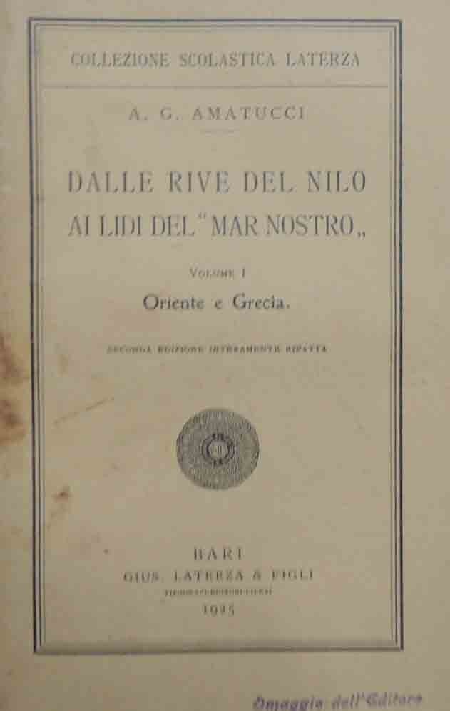 Aurelio Giuseppe Amatucci, Dalle rive del Nilo ai lidi del Mar Nostro. Vol. I: Oriente e Grecia, Gius. Laterza e Figli Tipografi-editori-librai, Bari 1925, seconda ed. interamente rifatta, pp. VI, 224, ill. b. n., cm 21, br. ed. Collana Collezione scolastica Laterza. Timbro Omaggio dell’editore all’occhiello e alla prima di copertina. Firma d’appartenenza all’occhiello e al frontespizio. Tracce d’uso alla brossura con dorso restaurato e con piccolissime mancanze, per il resto fioriture, leggera brunitura della carta, ma copia ancora in condizioni più che accettabili con interno pulito e perfettamente fruibile.