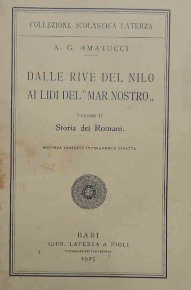 Aurelio Giuseppe Amatucci, Dalle rive del Nilo ai lidi del Mar Nostro. Vol. II: Storia dei Romani, Gius. Laterza e Figli Tipografi-editori-librai, Bari 1925, seconda ed. interamente rifatta, pp. VIII, 269, ill. b. n., 1 c. di tav. f.t. ripiegata ill. b.n., cm 21, br. ed. Collana Collezione scolastica Laterza. Timbro Omaggio dell’editore all’occhiello e alla prima di copertina. Tracce d’uso alla brossura con dorso restaurato e con piccolissime mancanze, per il resto fioriture, leggera brunitura della carta, ma copia ancora in condizioni più che accettabili con interno pulito e perfettamente fruibile.