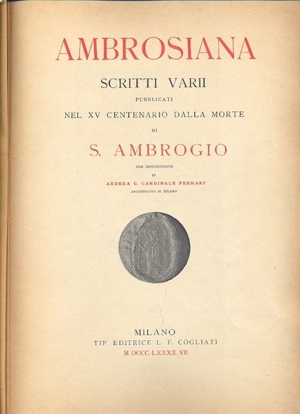 Ambrosiana. Scritti Varii pubblicati nel XV Centenario della Morte di S. Ambrogio con introduzione di Andrea C. Caardinale Ferrari.