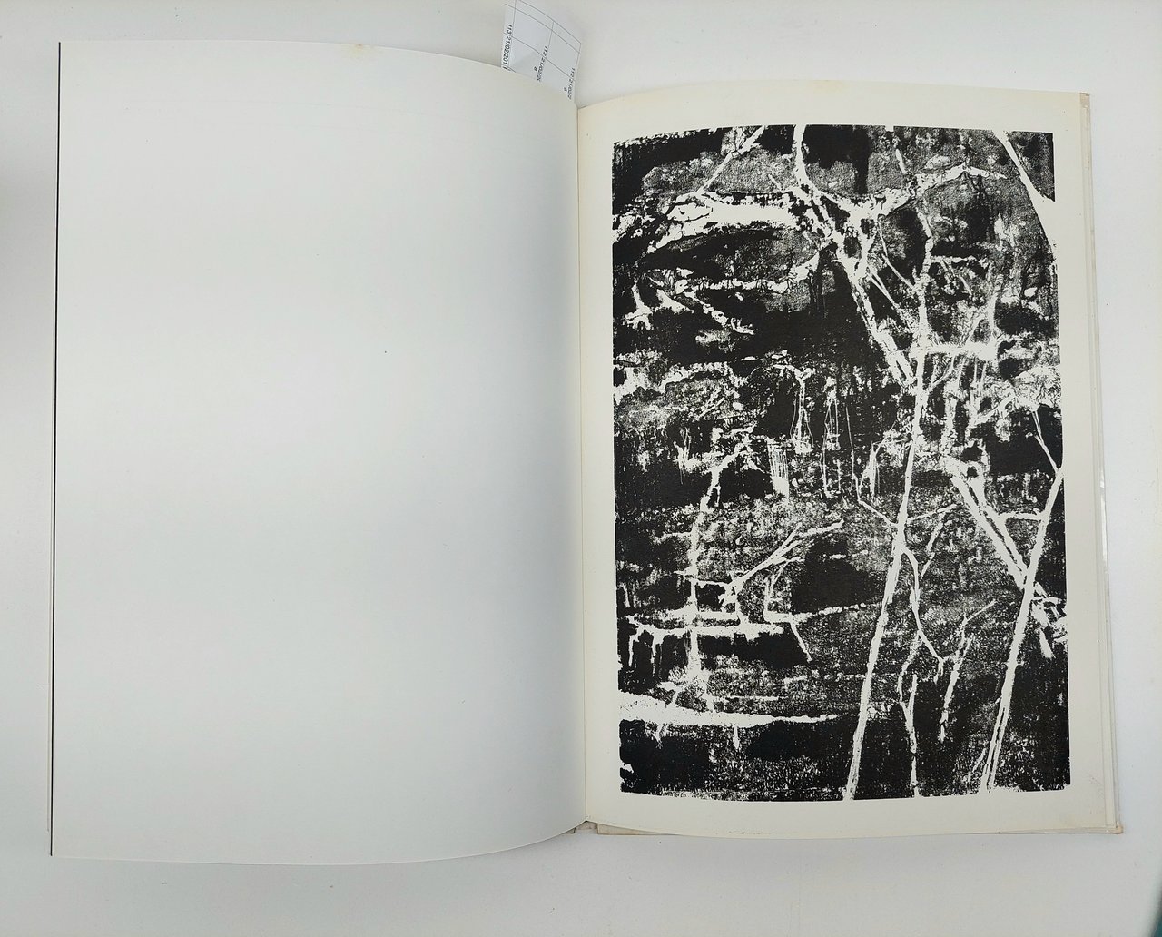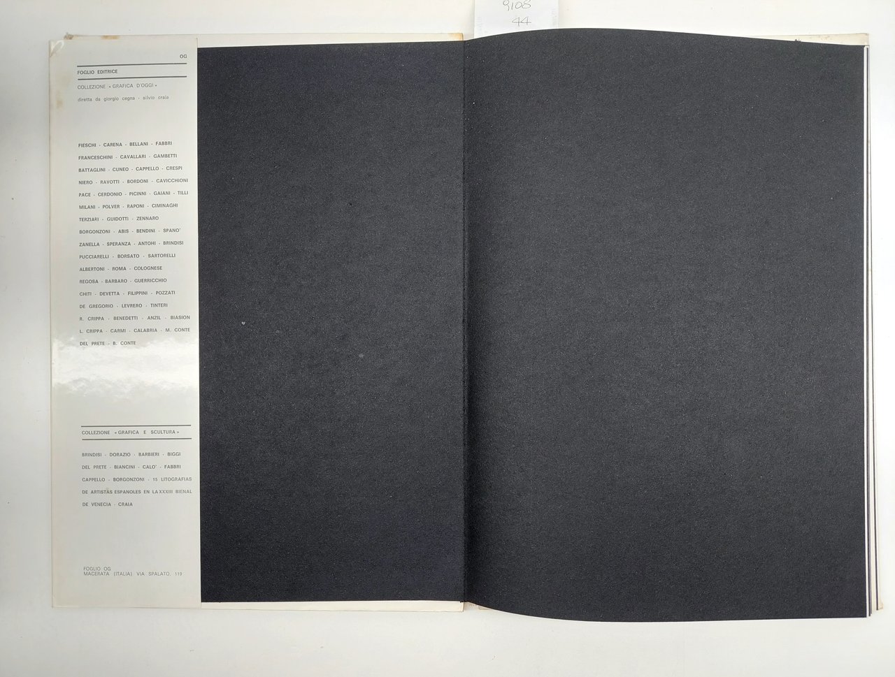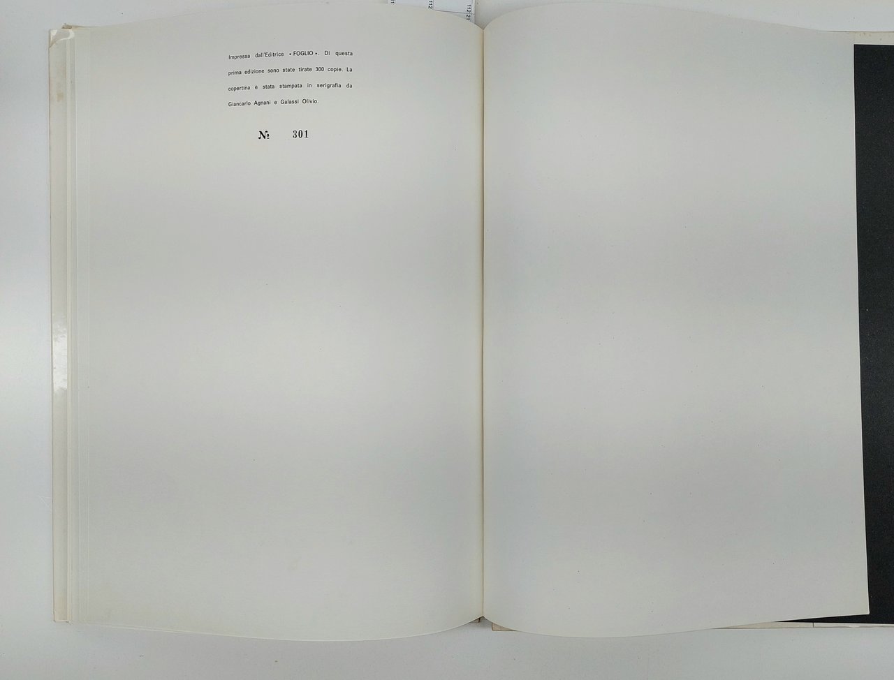 sovraccoperta editoriale con sporcizie e aloni ai piatti e al dorso, segni del tempo, legatura rigida in cartonato bianco con dorso in tela nera, fogli di guardia colorati, fioriture al margine dell'ala interna, lieve abrasione al margine inferiore dei piatti, pagine non numerate, copia numero 301 di 300 dimensioni cm 33,5 * 25