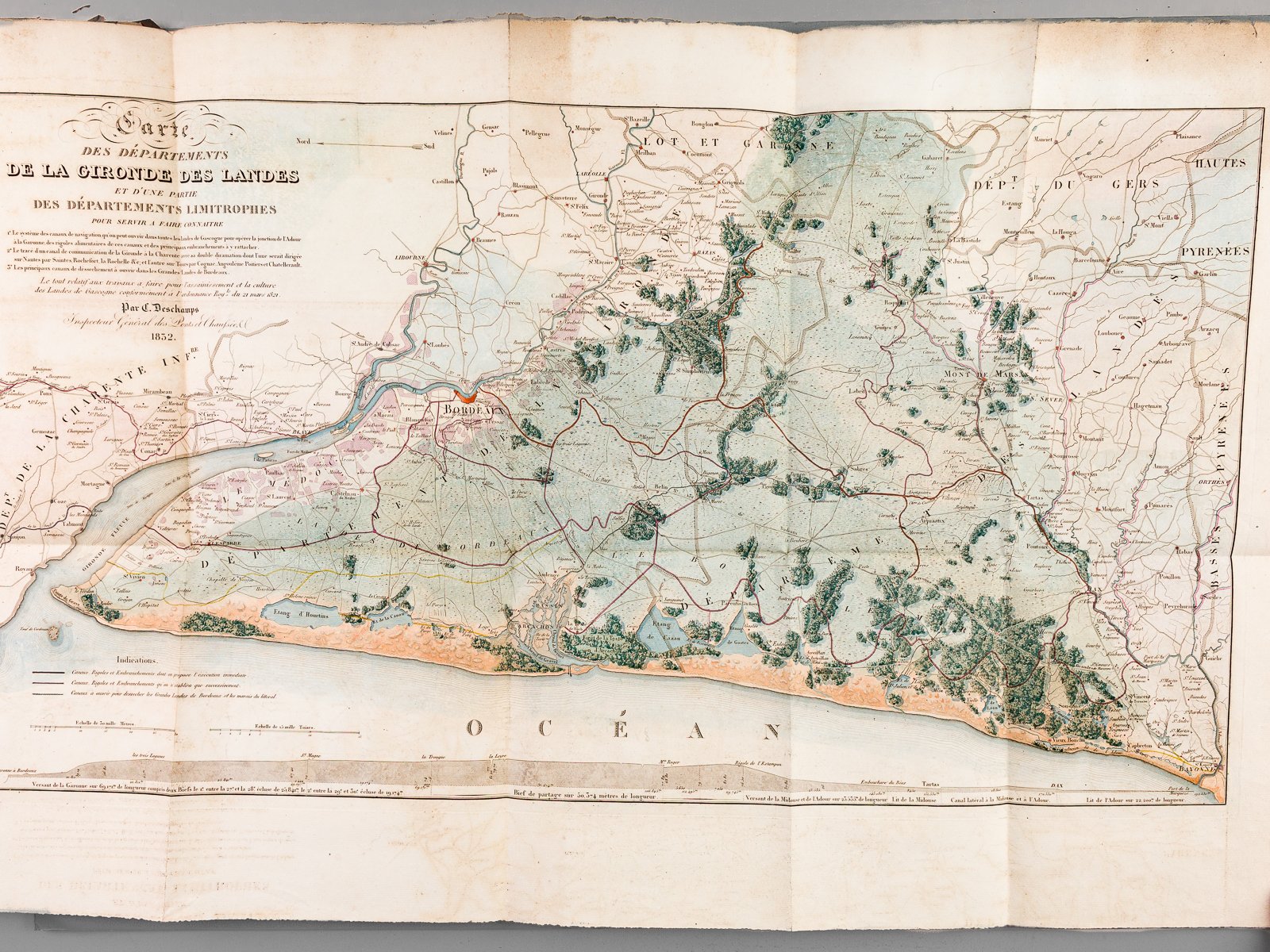 1 vol. in-4 br., Chez Carilian-Goeury, Paris, daté 1832-1836 en page de titre : Amélioration des Landes de Gascogne, par des Canaux de navigation, de dessèchement, d'irrigation et d'autres travaux ; Communication fluviale de l'Adour à la Gironde par la Midouze et la Leyre, et avec les ports de Bayonne, de Bordeaux et le Bassin d'Arcachon [ Contient 3 titres : ] Des travaux à faire pour l'assainissement et la culture des Landes de Gascogne, et des Canaux de Jonction de l'Adour à la Garonne, 1832 [ 1836 ], 2 ff., 75 pp. [ Suivi de : ] Compte-Rendu des Etudes, Expériences et Opérations faites pour parvenir aux Projets : 1e De l'Amélioration des Landes de Gascogne, par un canal de navigation réunissant l'Adour à la Gascogne, et par divers embranchements, qui viendraient s'y rattacher 2e De la jonction de la Gironde à la Charente, par un second canal, correspondant à l'un des embouchures de ceux des Landes, pp. 65-77 [ Suivi de : ] Prospectus. Recueil de Mémoires sur divers travaux d'utilité publique, exécutés ou projetés tant en France que dans les pays qui en ont fait temporairement partie, 1838, 20 pp. et une grande carte dépliante en couleurs (format 47,5 x 80 cm) Rare et très remarquable recueil établi par l'éditeur réunissant 3 publications de l'ingénieur Claude Deschamps (1765-1843) qui fut notamment le créateur du Pont de Pierre de Bordeaux. On y trouvera in-fine la superbe grande carte dépliante datée de 1832, rehaussée à l'aquarelle, détaillant le littoral aquitain entre les embouchures de la Gironde et de l'Adour, et intitulée : "Carte des Départements de la Gironde des Landes et d'une partie des Départements limitrophes pour servir à faire connaître 1e Le système des canaux de navigation qu'on peut ouvrir dans toutes les landes de Gascogne pour opérer la jonction de l'Adour à la Garonne, des rigoles alimentaires de ces canaux et des principaux embranchements à y rattacher 2e Le tracé d'un canal de communication de la Gironde à la Charente avec sa double diramation dont l'une serait dirigée sur Nantes par Saintes, Rochefort, la Rochelle &c ; et l'autre sur Tours par Cognac, Angoulême, Poitiers et Chatellerault 3e Les principaux canaux de déssechement à ouvrir dans les Grandes Landes de Bordeaux". Cette carte exceptionnelle est merveilleusement mise en couleurs : le massif forestier landais, s'y révèle encore très limité face aux immenses zones humides, et la représentation très esthétique du long cordon dunaire du littoral fait songer aux travaux de Claude Massé. Inspecteur divisionnaire à Bordeaux à la fin de sa carrière, Claude Deschamps réfléchit longuement à un projet des Canal des Grandes Landes entre la Garonne et l'Adour, de Bacalan à Dax, mais aussi à l'assèchement des Landes dans le Médoc ou au creusement d'un canal traversant la pointe du Cap Ferret. Exemplaire modeste (débroché, avec nombreux manques en couv., intérieur et carte en bon état) méritant d'être établi dans une reliure de qualité.