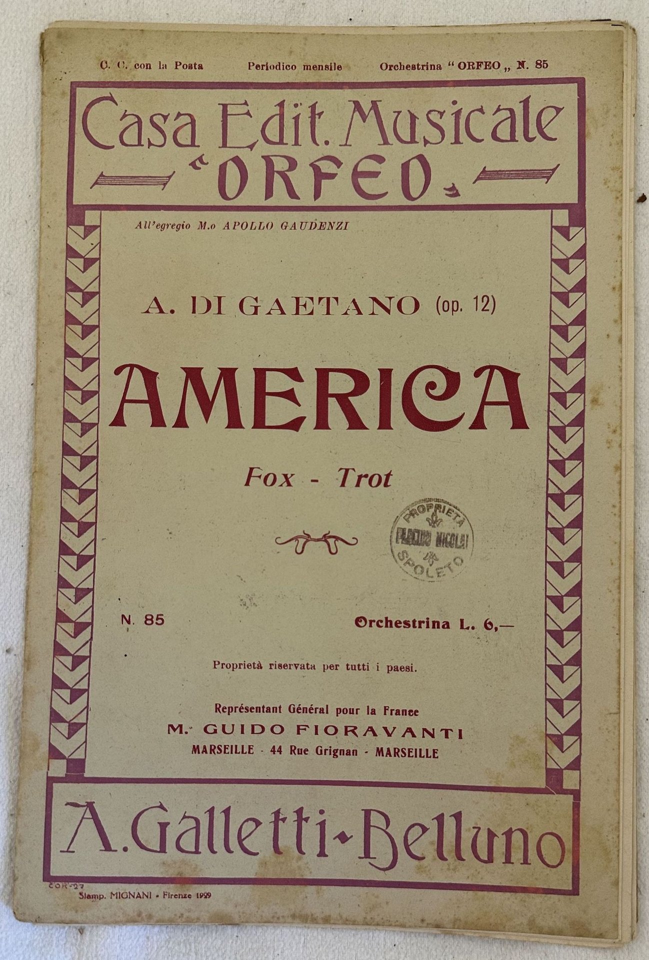 Partitura completa per orchestra del 1929 di una canzone. Caratteristica copertina decorata dell'epoca. GENERE: Fox trot STRUMENTI: pianoforte; violino; violoncello; sassofono, clarinetto, flauto, contrabasso, tromba, trombone, batteria ANNO: 1930 DIMENSIONI: In 8. cm 27x17,5 PAGINE: pp. 13 CONDIZIONI: Buone condizioni, fioriture NOTE: Ex libris sulla copertinaBeautiful score of one song, a complete score for orchestra of 1929.<BR>Carachteristic decorated cover of that period.<BR>MUSIC: Fox trot STRUMENTI: piano; trombone; drums; contrabbass violin; violoncello; saxophone, clarinet, flute, trumpet YEAR: 1930 SIZE: In 8. cm 27x17,5 PAGES: pp. 13 CONDITIONS: Good conditions, foxings<BR>NOTES: Ex libris in the cover