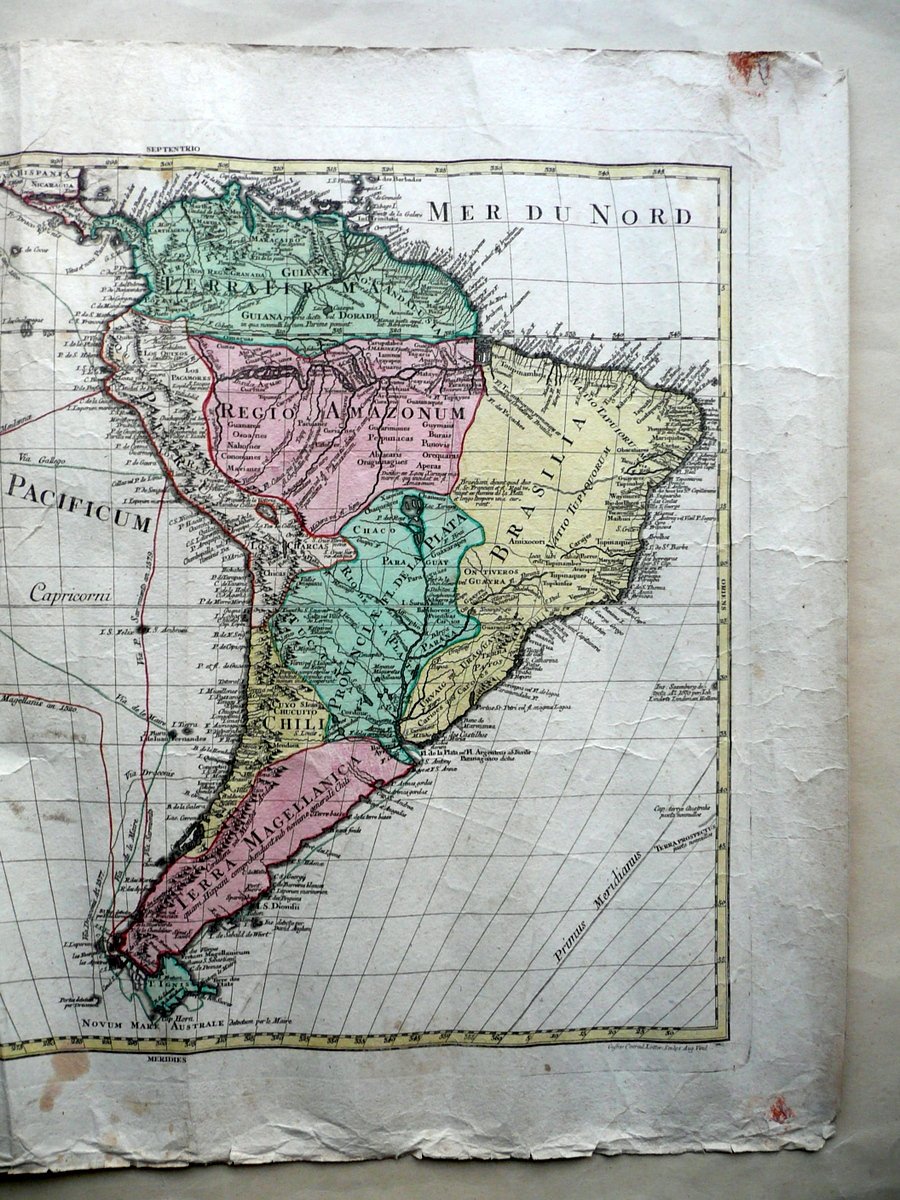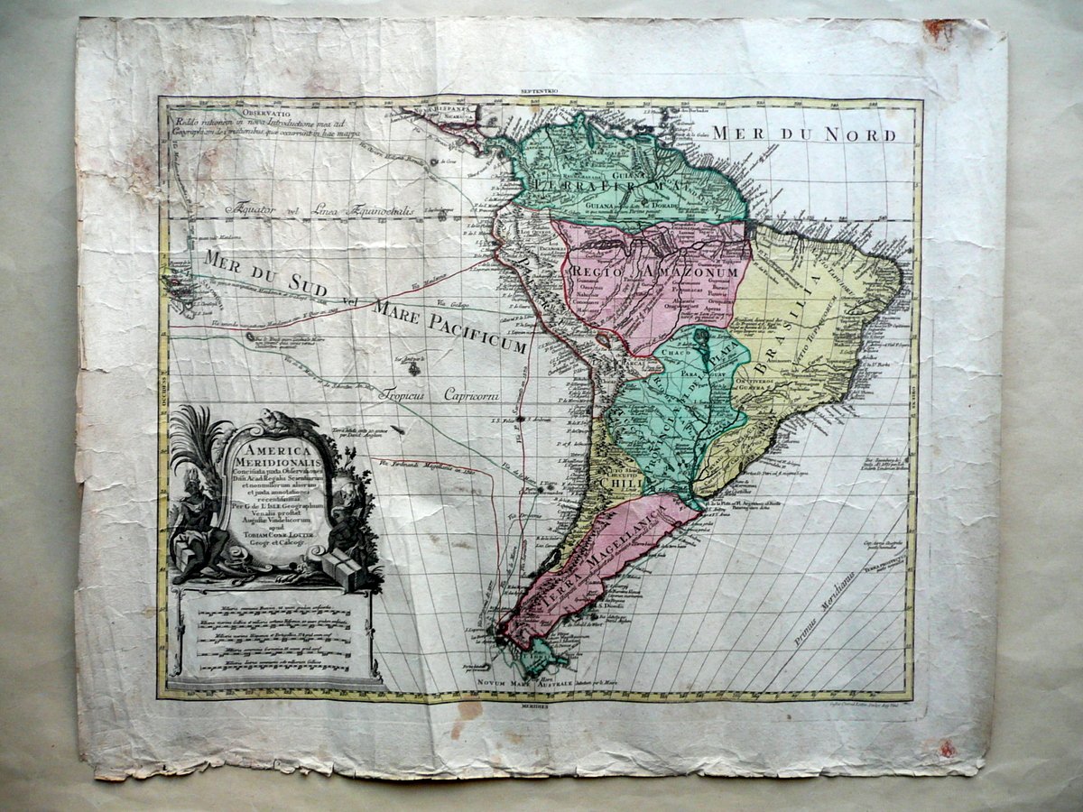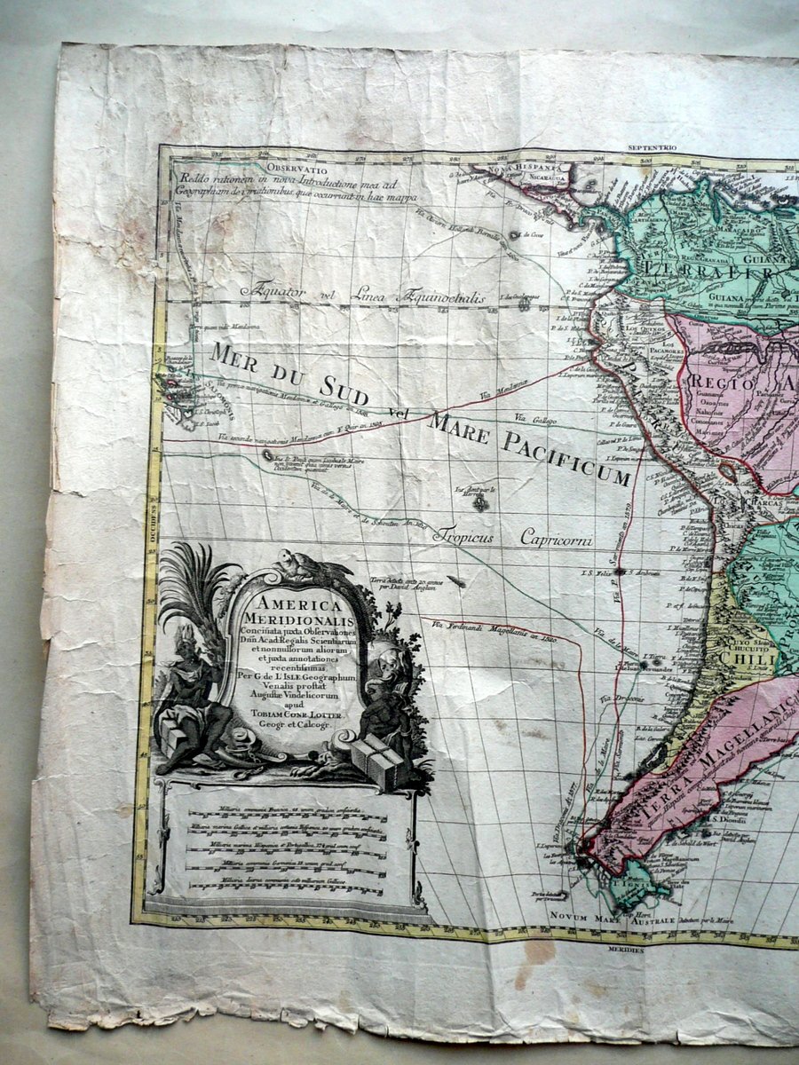Grande carta geografica, America Meridionalis [.] Per G. de L'Isle Geographum Venalis prostat Augustae Vindelicorum Apud Tobiam Conr. Lotter, Geographum et Calcographum T. C. Lotter, Augusta (Germania), s. d. (ma 1740); grande bella carta geografica d'epoca a colori dell'America meridionale, incisa su crta; confini, stati, rotte marittime e margini a colori (colorazione d'epoca); didascalia descrittiva entro bella cornice ill. in b/n. Cm 56,5x69. Testi in latino. Condizioni di conservazione Esemplare complessivamente ben conservato con tracce d'uso e del tempo; alcune piccole leggere bruniture e aloni, minimi accenni di sporco; margini e angoli con alcuni piccoli / minimi strappetti e poche minime mancanze; un margine sup. con un paio di strappetti di alcuni cm e qualche piccola mancanza, restaurato al retro mediante l'applicazione di vecchia stampa ottocentesca a colori (vedi foto). EXTRAR0011 S01