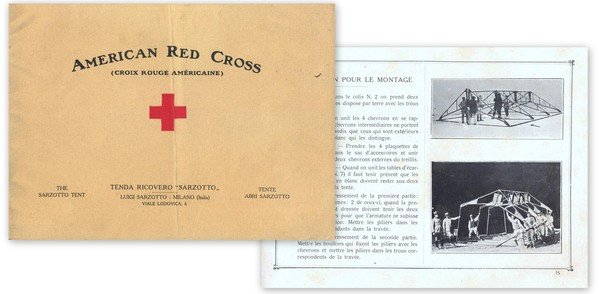 In 16° oblungo, br. edit., pp. 18, con ill. b.n. n.t.; libretto di istruzioni della tenda Sarzotto usata dalla Croce Rossa; buon es.