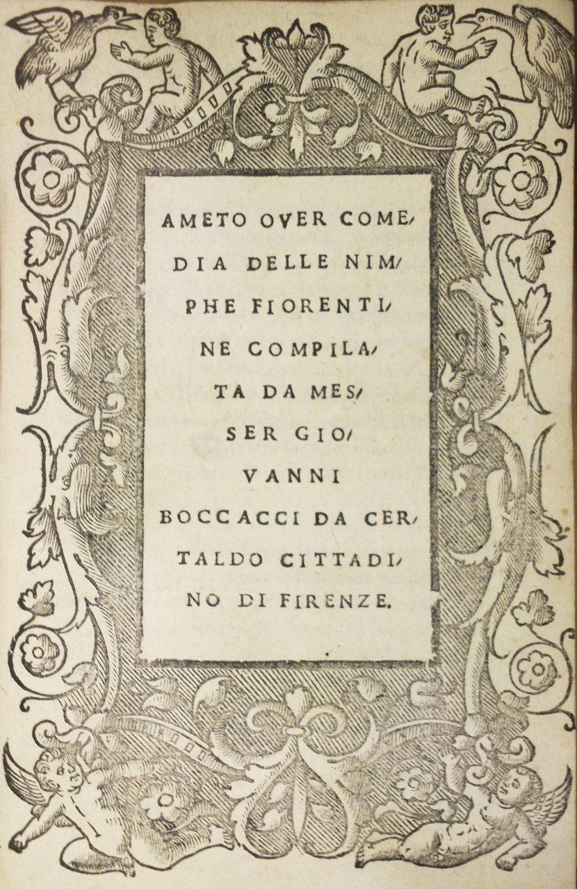 In-24 gr. (mm. 145x92), p. pergam. antica, titolo oro su tassello al dorso, 95 cc.num., compreso il bel frontespizio inquadrato in una ricca cornice silografica, con motivi allegorici; marca tipografica in fine. Manca l'ultima carta che è bianca. Cfr. Adams,I,p. 173 - Sander,I,1057 - Graesse,I,447 (in nota): copiée de l'édition Juntine de 1521.. - Gamba,201 (in Nota): Col titolo di "Ameto Comedia delle Ninfe Fiorentine" ebbe quest'operetta (tutta frammischiata di versi e prose e che ha poi avuto molte imitazioni, principalmente l'Arcadia di Sanazzaro e gli Asolani del Bembo) molte ristampe - Bacchi della Lega, p. 99.Esemplare ben conservato.