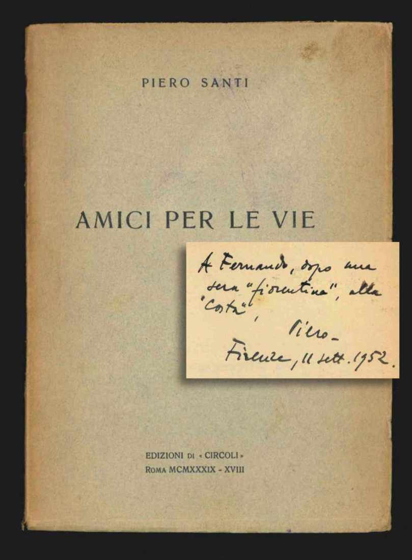 LIBROPrima edizione.CON AUTOGRAFO.Ottimo esemplare (dorso leggermente brunito, qualche traccia di sporco alla brossura). Dedica autografa dell’autore [a Fernando Palazzi?]: A Fernando dopo la sua sera “fiorentina”, alla “Costa”, Piero. Firenze, 11 sett. 1952». Pecetta «Aumento sul prezzo di copertina 5 %» al piatto posteriore.Edizione originale, opera prima. Santi, che già collaborava con molte illustre riviste fiorentine, «negli anni che precedettero e seguirono l’inizio della guerra pubblicò anche le sue prime prove letterarie, «Amici per le vie» (Roma 1939) e «Avventure nel parco» (Firenze 1942): due raccolte di racconti in cui si trovano già espressi alcuni tra i caratteri peculiari della scrittura santiana, che probabilmente dà il meglio di sé proprio nella misura del racconto Nelle storie di Santi, ambientate in un microcosmo fiorentino che sovente si restringe ulteriormente al familiare paesaggio del parco delle Cascine, sembra non accadere nulla di rilevante, e la scrittura, secca, laconica, accentuatamente paratattica, veicola appieno questa sensazione; tuttavia, a un certo punto, affiora sempre un elemento di rottura, che turba le misere esistenze dei personaggi senza peraltro portarli a una maturazione, confinandoli in una condizione di perenne stallo e scacco. Questo primo nucleo della narrativa di Santi presenta anche altri aspetti significativi e durevoli: l’esclusività del paesaggio fiorentino, asfittico e castrante, ma ineludibile; la centralità del tema dell’infrazione, che si declina anche come peccato, segno del dissidio tra un cristianesimo mai abiurato e un’omosessualità vissuta sì alla luce del sole, ma non senza lacerazioni; la centralità dell’amicizia, sola consolazione per l’uomo» (Sandro De Nobile, «Santi», voce del «Dizionario biografico degli Italiani», volume 90, 2017).
