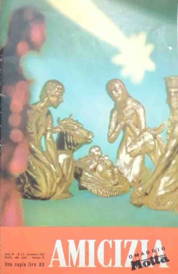 Amicizia. Rivista mensile, anno IX, n. 12, dicembre 1965, pp. 47, ill. b.n. e col., cm 28, pubblicazione spillata. In calce alla prima di copertina: Omaggio Motta. Minime tracce d’uso, lieve ingiallitura della carta, per il resto perfetto.