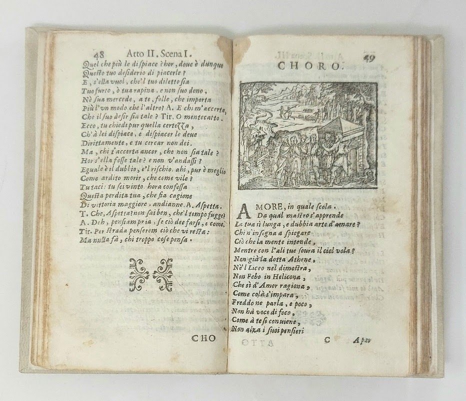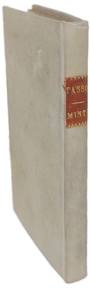 >2 opere in un vol. in-24, pp. 88; 114; legatura mod. p. perg., tit. oro al dorso. Ritratto del Tasso in ovale su entrambi i frontespzi, testatine, fregi e 9 vignette xilogr. per l'Aminta. Ambedue le opere teatrali in origine facevano parte, con proprio frontespizio, dell'edizione delle ''Rime divise in amorose, boscherezze, Maritime, Imenei, heroiche, morali, lugubri, sacre e varie'' pubblicate dal Deuchino in 2 vol., 1621-22. Grazioso esemplare. Racc. Tassiana Bergamo rinvia per entrabi al n. 48.
