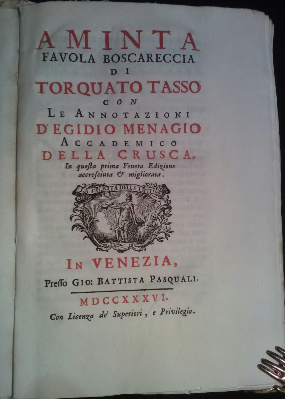 Aminta. Favola boscareccia con le annotazioni d'Egidio Menagio. In questa prima Veneta Edizione accresciuta e migliorata