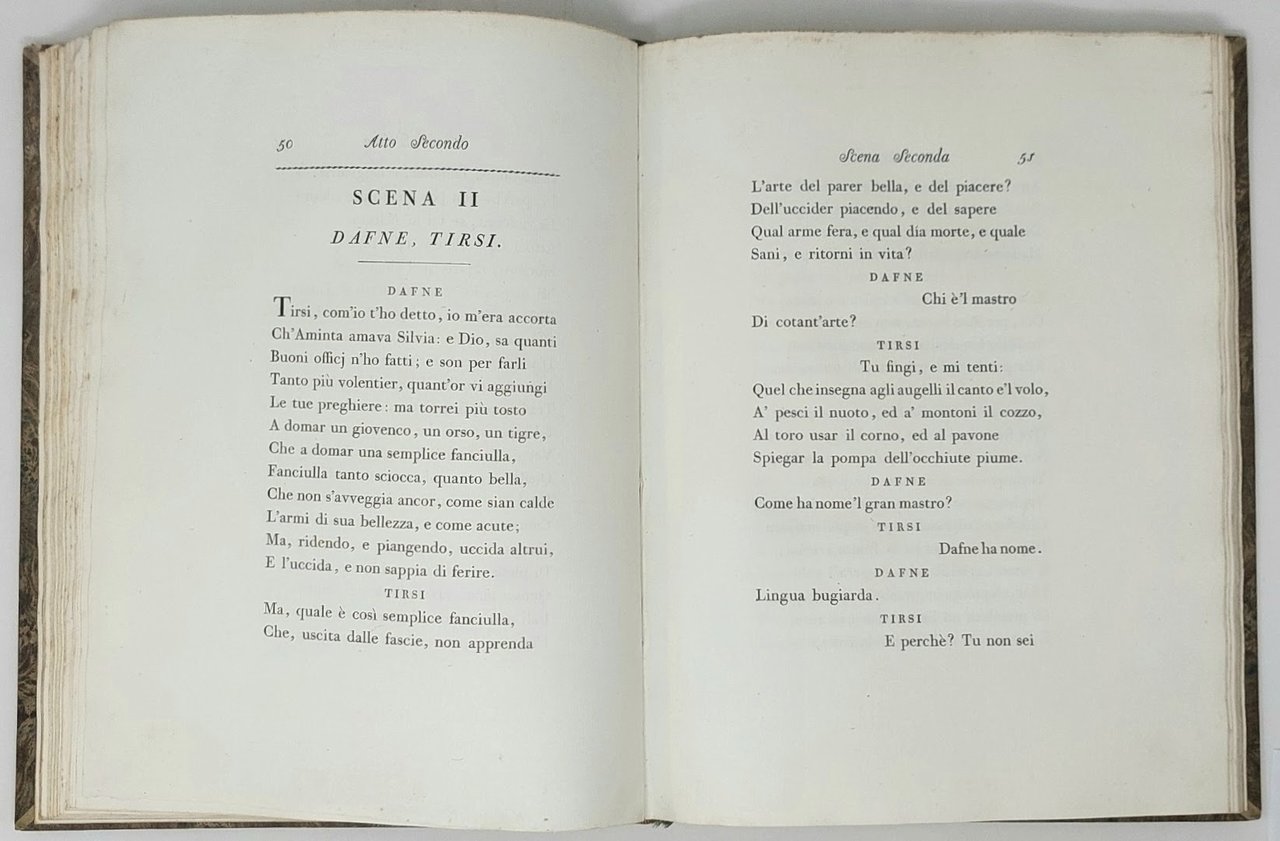 >in-4, 8 ff. nn. (i primi due bianchi), pp.14 pp., (2), 142, 1 f.bianco, legatura coeva in mezza pergamena, tassello granata e filetti oro al dorso. Ritratto del Tasso in medaglione tondo inc. sul titolo, una testata inc. con stemmi araldici dei Malaspina, car. corsivo per il poema di dedica, tondo per il testo. I tipi furono espressamente fusi e incisi. Magnifica edizione dell'Aminta bodoniana, dramma pastorale in cinque atti. Precedono: la dedica del Bodoni (attribuita al Monti) in car. corsivo; la prefaz. del Serassi, l'invio di B. ai lettori. Seguono il testo quattro Intermedi e l'Amore Fuggitivo, anch'essi del Tasso. Bell'esemplare. Brooks, n.379. De Lama p.54. Gamba, 958 ''magnifica edizione''. Renouard: ''l'une des plus belles editions de Bodoni''.