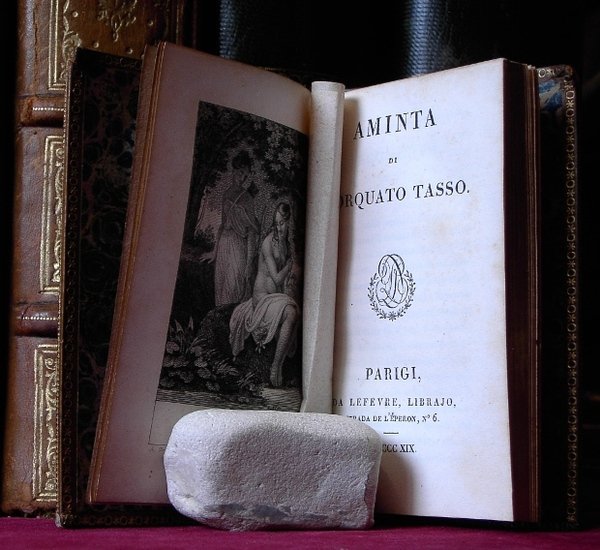 Delizioso piccolo volume in 16 (cm. 10,5 x 7), elegante legatura in piena pelle, piatti inquadrati a secco e rifiniti al bordo ed al risvolto interno con cornice greca impressa ai piccoli ferri e decorata in oro, dorso a cinque nervi, impresso a scomparti e decorato in oro, titolo al tassello al dorso, tagli dorati, sguardie marezzate, segnalibro in seta, bianca, occhiello, al primo volume antiporta con tavola allegorica incisa in rame e protetta da velina, frontespizio, argomento e prologo, 123 pp., bianche finali. Aggiunti in fine gli 'Intermedi' e 'l'Amore fuggitivo'. Un piccolo gioiellino, in ottimo stato, carta forte e bianca, impaginatura e inquadratura perfetta, piccolo ma chiaro e leggibile alfabeto tondo romano. Insomma, delizioso tout court. Raro e piacevolissimo.