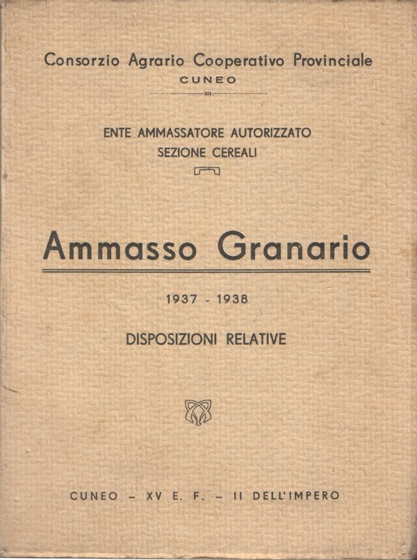 In-16° (cm 18,8x14), pp. 47, (1), copertina editoriale. In stato di conservazione molto buono. Non comune. Indice: Prefazione; Disposizioni Ministeriali; D. L. sul grano da seme; Regolamento ammasso 1937; Organizzazione periferica; Norme contabili; Elenco Magazzini; Copie stampati. Nella tabella "Organizzazione periferica", per ogni centro di raccolta sono indicati, ove presenti, il commissario, il segretario, il magazziniere, i magazzini, le zone convergenti ed i giorni di ritiro. I centri di raccolta elencati sono: Cuneo, Centallo, Caraglio, Dronero, Beinette, Borgo San Dalmazzo, Busca, Tarantasca, Saluzzo, Verzuolo, Revello, Scarnafigi, Barge, Moretta, Polonghera, Villanova Solaro, Savigliano, Cavallermaggiore, Racconigi, Caramagna, Cavallerleone, Bra, Cherasco, Sommariva Bosco, Narzole, Cervere, Alba, Canale, Ceresole, Cortemilia, Santo Stefano Belbo, Monchiero, Monforte, Dogliani, Niella Belbo, Neive, Mondovì, Ceva, Murazzano, Saliceto, Camerana, Monesiglio, Morozzo, Fossano, Benevagienna, Trinità, Sant'Albano Stura, Carrù, Villafalletto.