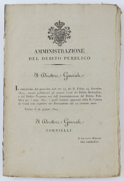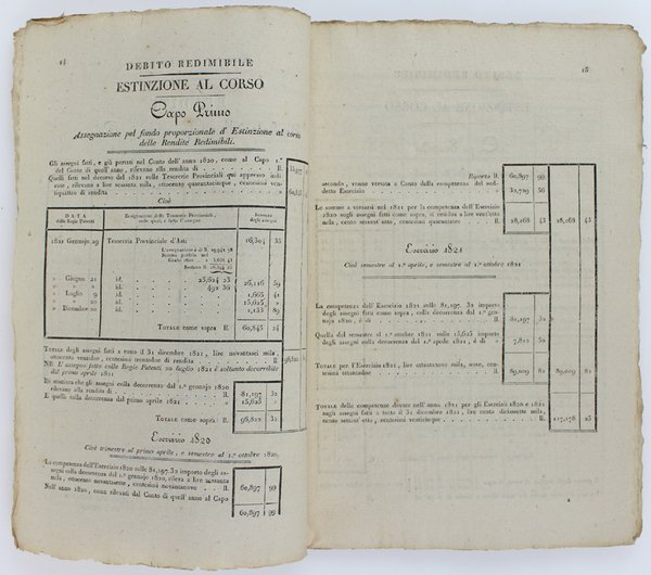 AMMINISTRAZIONE DEL DEBITO PUBBLICO - CONTO RESO DALL'AMMINISTRAZIONE DEL DEBITO PUBBLICO PER L'ANNO 1821. Debito Redimibile. Rendite. Estinzione al Corso. Torino, 26 giugno 1822.