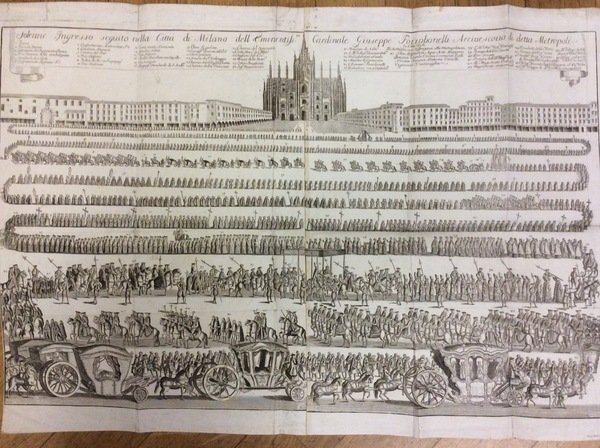 In-4 p. (mm. 310x216), cartoncino rustico coevo, pp. (12),84, con 4 tavole fuori testo inc. in rame e più volte ripieg., che raffigurano 3 archi trionfali: A capo il Corso di P.T. nel solenne ingresso nella Città di Milano dell'Em. Giuseppe Pozzobonelli.. - A capo della contrada de Piatti in P.T.P.S. Gior°. in PaIazzo di Milano.. - Alla Piazza del Duomo per il solenne ingresso.. li 21 giugno 1744 e la grande tavola che raffigura la processione diretta al Duomo, firmata da Marc'Antonio Dal Re.Solo lievi fioriture marginali ma certamente un buon esemplare.