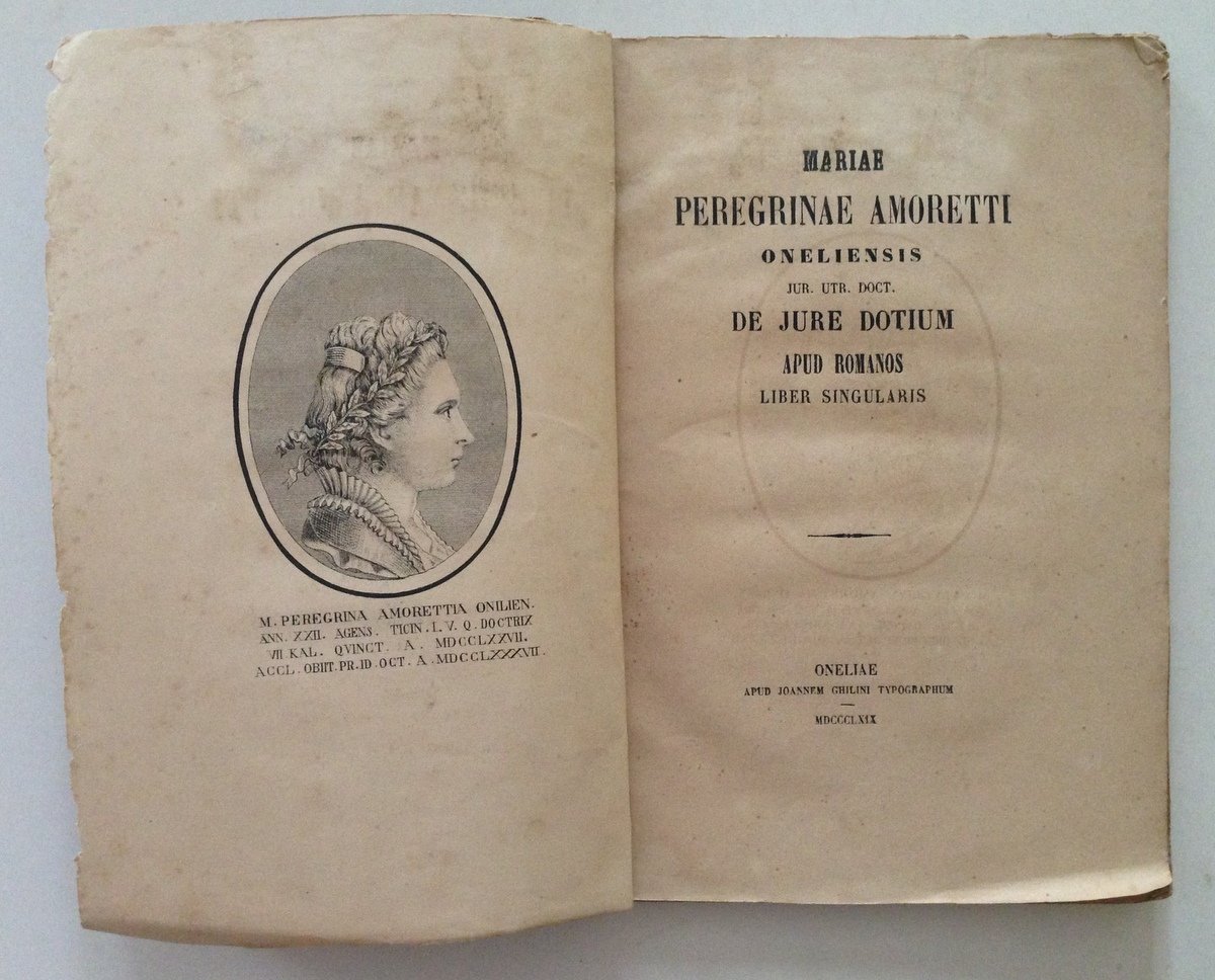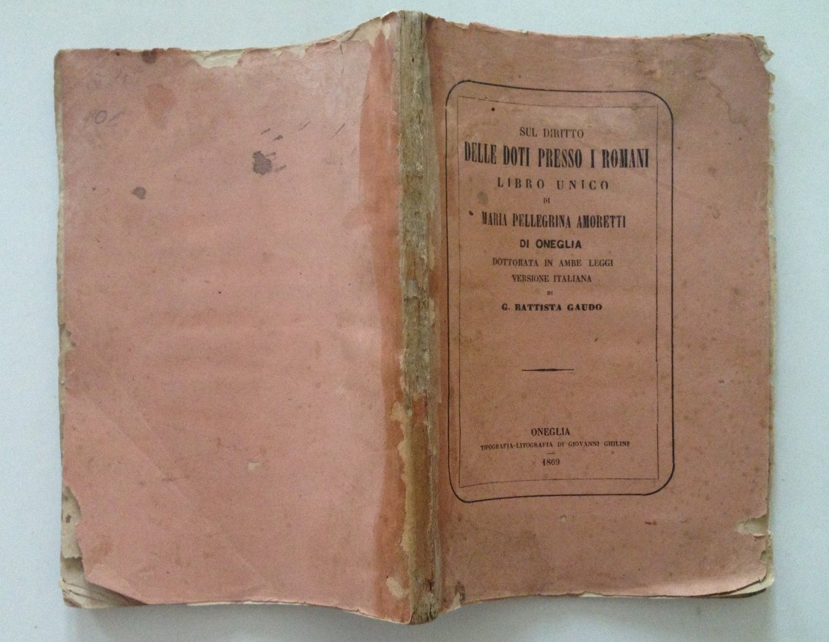 M.P. AMORETTI, SUL DIRITTO DELLE DOTI PRESSO I ROMANI VERSIONE ITALIANA DI G. BATTISTA GAUDO ONEGLIA, TIP. GHILINI 1869, in 8°, pp. 120, 1 ritratto in antiporta, br. ed. Condizioni di conservazione Esemplare in buono stato con tracce d'uso e con bruniture; brossura editoriale con macchie e con mancanze e pieghette ai margini e soprattutto agli angoli e al dorso; dorso mancante restaurato; interni buoni. MM1229.E4-188