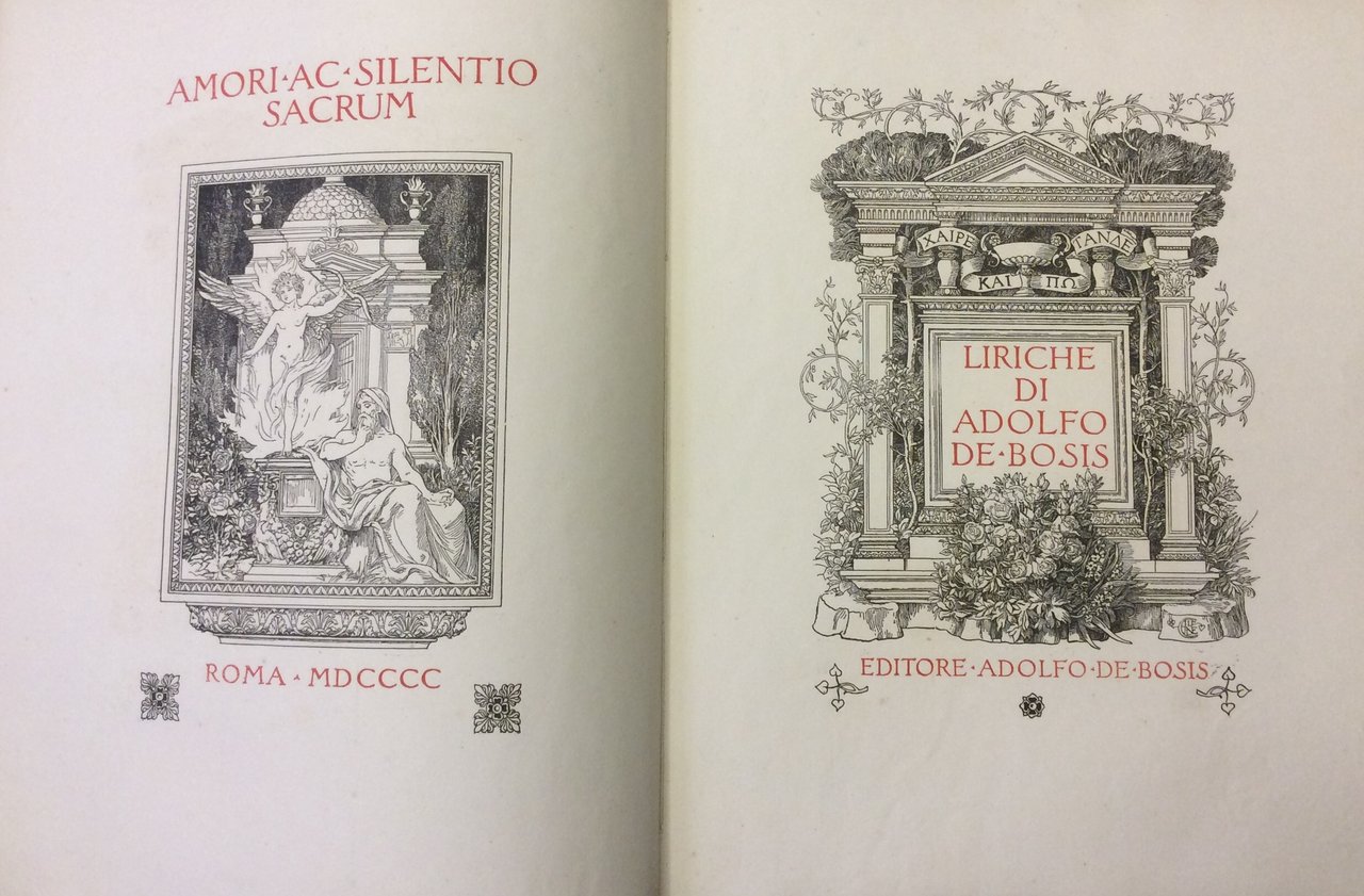 In-4 p., cartonato mod., titolo oro su tassello al dorso, conserv. cop. orig. figur. in pergamoide, pp. (2),182,(2), belliss. antiporta e frontespizio xilografati; tit. in rosso e nero. "Prima edizione" di queste liriche stampate privatamente dal De Bosis (e certamente in pochi esemplare) e poi raccolte nel XII libro del "Convito". Elegante edizione su carta di Fabriano con la filigrana che raffigura la coppa conviviale. Esempl. con dedica autografa dell'A., molto ben conservato (solo su 2 pp. è rimasta l'impronta, pesantemente ingiallita, di un foglio inserito nel vol.).