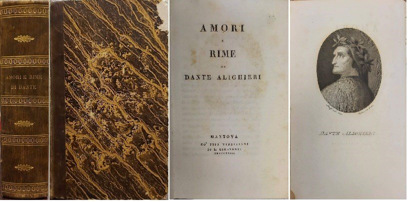 gr. vol. in-16, pp. XVIII, CCCXXI, 207, bella leg. m. pelle coeva con tit. e fregi oro a d., piatti in carta dec. Con 2 ritr. inc. in rame da Giacon, di ottima fattura, di Dante (su dis. di Raffaello) e e di Beatrice (su dis. di Canova). Contiene una lunga prefazione di Luigi Perticari indirizzata a Caranenti, e il testo dell'insigne dantista mantovano Conte Ferdinando Arrivabene (1770-1834) dal titolo "Gli amori di Dante e Beatrice colti d'allegoria ed avverati con autentiche testimonianze". Seguono nella seconda parte i Sonetti, Ballate, Canzoni, Sestine, con ampi indici. Bell'esempl. [276]