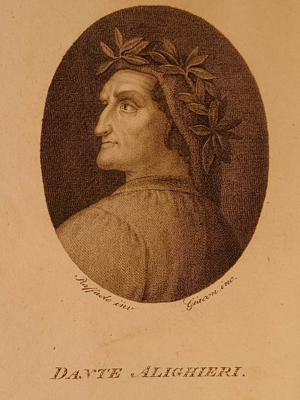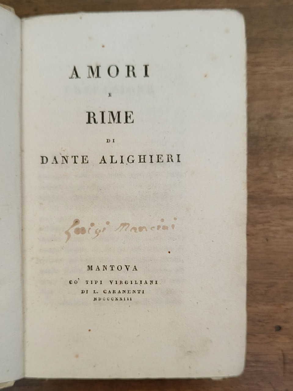 Amori e rime, Mantova, Caranenti, 1823. Cm 16,2. Pp. CVIII CCCXXI 207. Legatura cartonata coeva. Piatti e dorso con abrasioni e strappi. Due tavole fuori testo incise da Giacon raffiguranti Dante (su dis. di Raffaello) e Beatrice (su dis. di Canova). Contiene una lunga prefazione di Luigi Perticari indirizzata a Caranenti, e il testo dell'insigne dantista mantovano Conte Ferdinando Arrivabene (1770-1834) dal titolo "Gli amori di Dante e Beatrice colti d'allegoria ed avverati con autentiche testimonianze". Seguono nella seconda parte i Sonetti, Ballate, Canzoni, Sestine, con ampi indici.