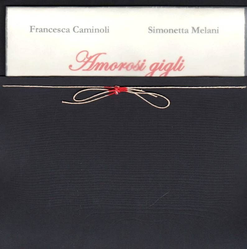 Cartellina In-8° carré (cm 21), in custodia editoriale in cartoncino nero; contiene sei quartini sciolti, di cui l'ultimo con l'incisione di Simonetta Melani. Edizione di 53 copie numerate e firmate dagli autori. Francesca CAMINOLI, giornalista, ha lavorato a Milano in quotidiani e periodici fino al 1982, poi si è trasferita a Lucca. Ha pubblicato Il giorno di Bajram, Il Grandevetro/Jaca Book, 1999, e per la stessa casa editrice La neve di Ahmed, 2003 e C’erano anche i cani, 2013. Negli ultimi anni ha realizzato un giornale in Nicaragua con i ragazzi di strada del progetto 'Los Quinchos”, con cui collabora.