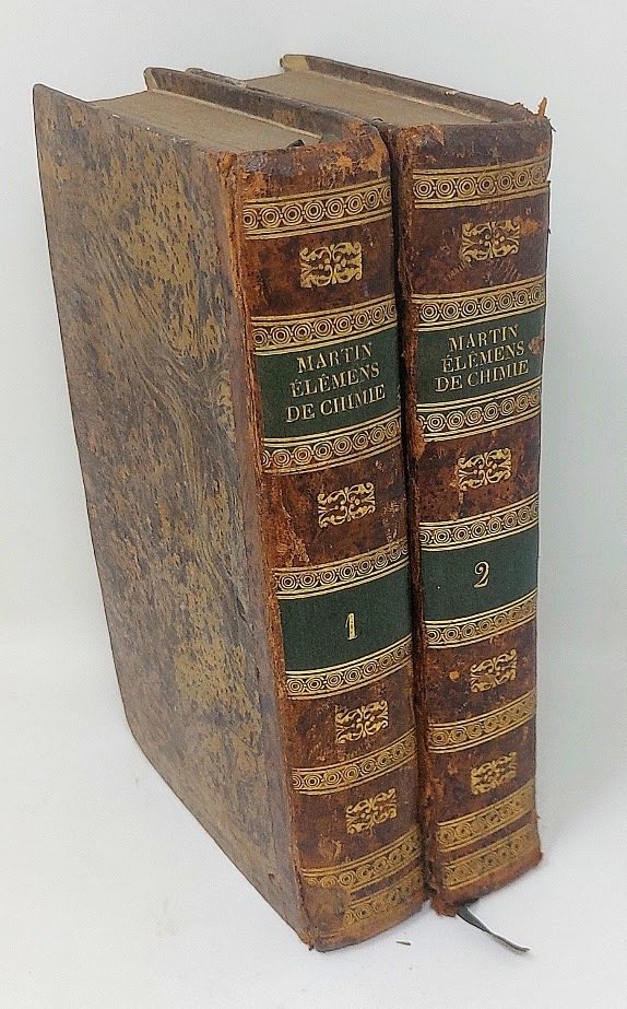 >2 vol. in-8, pp. XI, 558, (2); (4), 522, (4), legature coeva in mezza pelle, duplice tassello e fregi oro al dorso (piccoli difetti ai piatti). Completo di tre tavole f.t. più volte ripieg. Interessante trattato sull'applicazione della chimica in vari settori: quello artistico-librario (per la composizione delle vernici o della carta ad esempio), quello agricolo e quello manifatturiero (estrazione del ferro, arte vetraria, conceria...). Buon esemplare di interessante opera di chimica applicata (fioriture sparse). Non riscontrato in alcun repertorio.