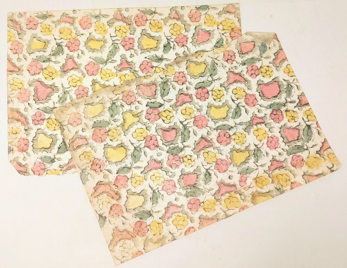 > 2 fogli (mm260x170) di carta decorata e xilografata. Motivo: ramages policromi (gialli, rosa e verdi) con fiori e foglie stilizzati su fondo bianco. Margini interni irregolari, uno dei due fogli presenta un lavoro di tarlo di ca 3 cm x 3 mm.