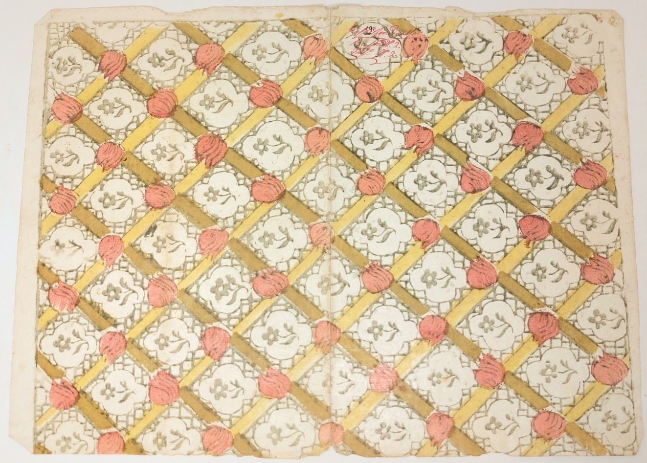 >Foglio (mm 405x205) di carta decorata e xilografata. Motivo: rombi che contengono fiorellini e boccioli di tulipano rosso agli angoli, fondo crema. Traccia di antica piegatura,antica nota di possesso ms su tre righe posta nell'angolo superiore sinistro.