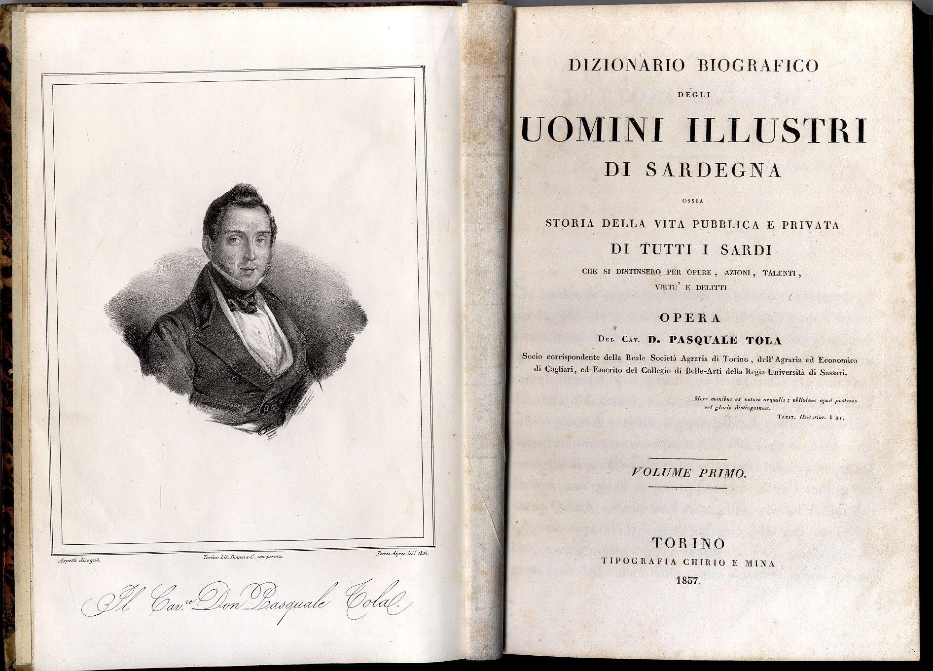 >3 volumi in-8, pp. 300, VIII, 287(1), 350, 34, legatura coeva in mezza pelle , titoli e filetti oro ai dorsi. Al primo volume ritratto litografico dell'Autore. In fine ad ogni volume si trova l'elenco dei sottoscrittori dell'opera, a proposito dei quali è interessante notare come siano saliti dagli 849 del primo volume ai definitivi 1063 segnalati sul terzo: è probabile che soltanto negli esemplari a questi destinati siano stati aggiunti i 61 ritratti di personalità, che non furono qui inseriti. Prima ed unica edizione di opera assai pregevole, che comprende le biografie ragionate di 858 personaggi illustri, corredate di utili referenze bibliografiche. Pasquale Tola fu corrispondente della Soc. Agraria di Torino e di Cagliari; oltre a far parte del Collegio della Università di Sassari. Dalla prefazione: "...in questo lavoro abbiamo compreso tutti i Sardi che in qualche maniere si ditinsero dall'universale... acciò abbiano tutti nella propria interezzala molta o poca fama che meritarono". Le 34 pagine aggiunte in fine sono una risposta del Tola a Ludovico Baille "Sulla patria di Carlo Buragna...". Lozzi, n.4867. Manca al Manno che lo cita.Ciasca 19215. Piloni n.1495-1561. Bocca 5570. Platner 349. Cat.Baille 394-96.