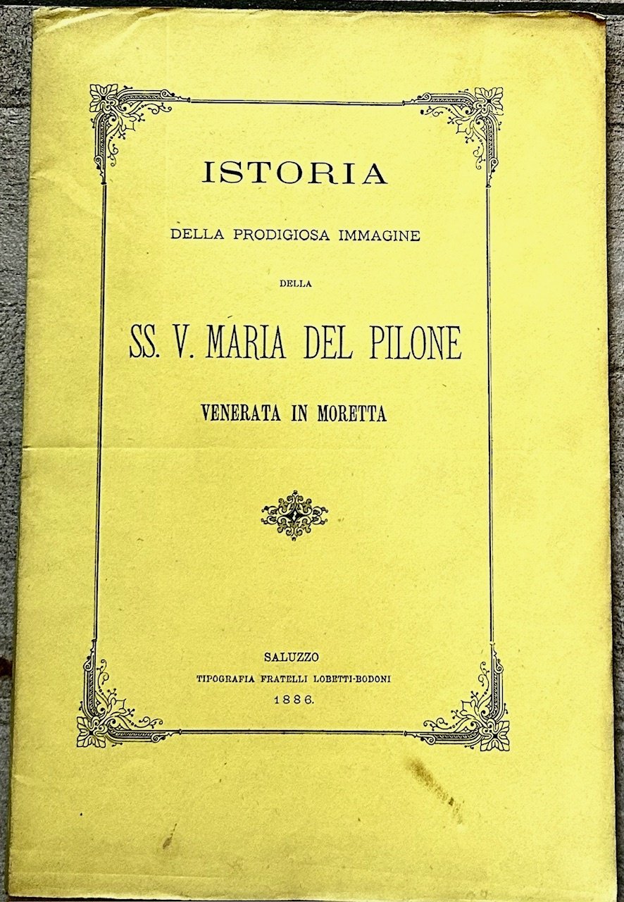 >in-8 (mm 235x155), pp. 78,in antiporta l'immagine della SS. Vergine,  brossura editoriale.  "La storia della prodigiosa immagine di Maria Santissima venerata in questo suo celebre Santuario sotto il titolo di Piloneda oltre due secoli vide la luce nel 1718 ed ebbe varie ristampe". Ben conservato.