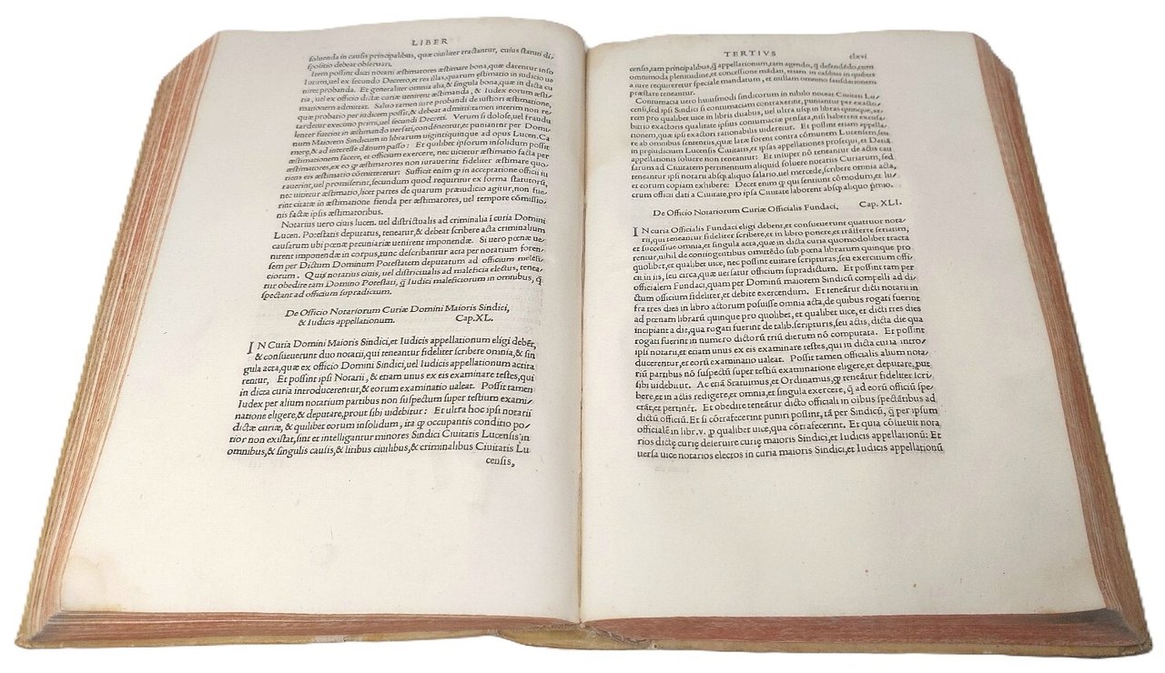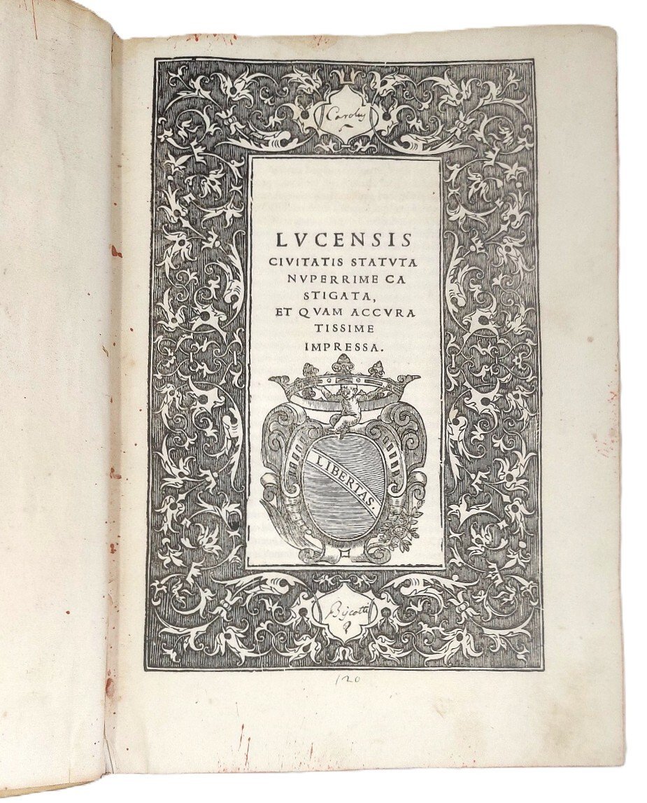 >in-folio (313x219 mm), ff. (6 di cui l'ultimo bianco), CCCXXXIX, (1). Legatura coeva in pergamena, titolo ms. al dorso, tagli rossi. Titolo entro bella bordura silografica a fiori su fondo nero, già utilizzata per l'ediz.1526 dell'Elephantutius; all'ultimo foglio xilografia a piena pagina con grande stemma della città retto da 2 angeli, mentre due leoni reggono un'iscrizione; iniziali ornate su fondo nero. Seconda edizione a stampa degli Statuti di Lucca, e prima pubblicazione della nuova compilazione decretata nel 1527 sulla base del testo del 1446; la stesura fu interrotta in seguito ai tumulti verificatisi in città e fu ultimata nel 1538, ma si dovette chiamare ad eseguirne la stampa il bolognese Giovanni Faello, poiché non vi erano tipografie in città. Si tratta dunque del primo libro impresso a Lucca nel XVI sec., che fa seguito a poche rarissime edizioni degli anni 1480-90 e precede di ben dieci anni l'installazione della prima stamperia fissa lucchese, di Vincenzo Busdrago. Bell'esemplare genuino e marginoso, con qualche piccola lieve gora e macchiette, alcune note manoscritte da mano antica. Il volume presenta numerose provenienze tutte lucchesi o toscane: ex libris a stampa del conte Sanminiatelli ed altro del Dott. Girolamo Biscotti al contropiatto anteriore; all'occhietto due ex-libris manoscritti, il primo (1796) del Senatore Federico de Nobili, il secondo (1817) di Carlo Biscotti, notaio in Lucca, che firma il frontespizio. Sander, 4027. Cat.Senato IV,123-4. Manzoni I,240. Fumagalli, Lexicon Typ.Italiae, p. 192-3.