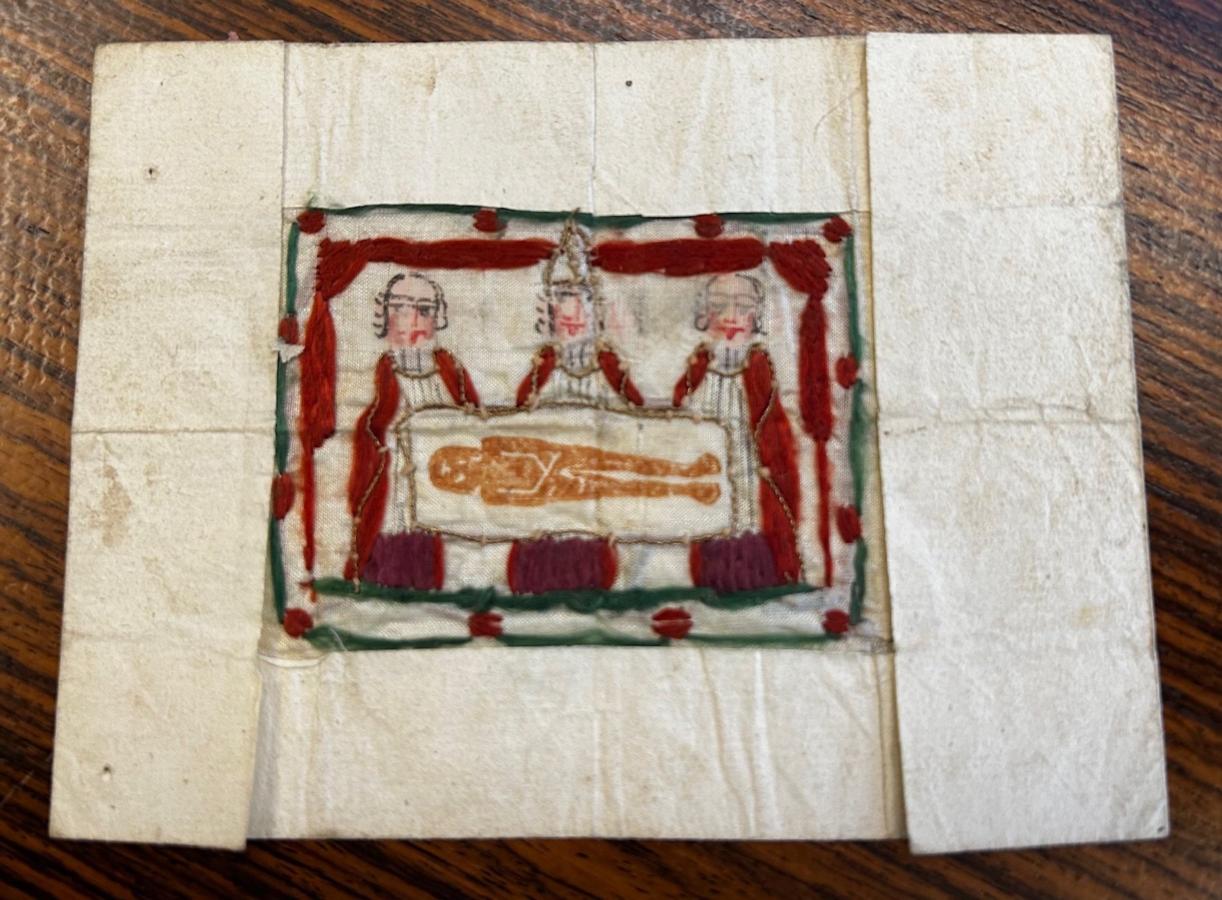 >Ricamo su seta ( mm 60x80) con fili d'argento e lana, volti dei personaggi e corpo di Cristo, dipinti a mano; supporto in seta anticamente applicato su carta. Il lenzuolo sindonico è sostenuto da tre figure in piedi: un vescovo mitrato al centro e due prelati ai lati. La Sindone di Besançon presenta l'immagine frontale del corpo di Cristo senza piaghe o ulcere, conosciuta, soprattutto attraverso incisioni del XVI e XVII. A lungo considerato il lenzuolo con cui era stato coperto Cristo dopo essere stato lavato e deposto nel sepolcro.