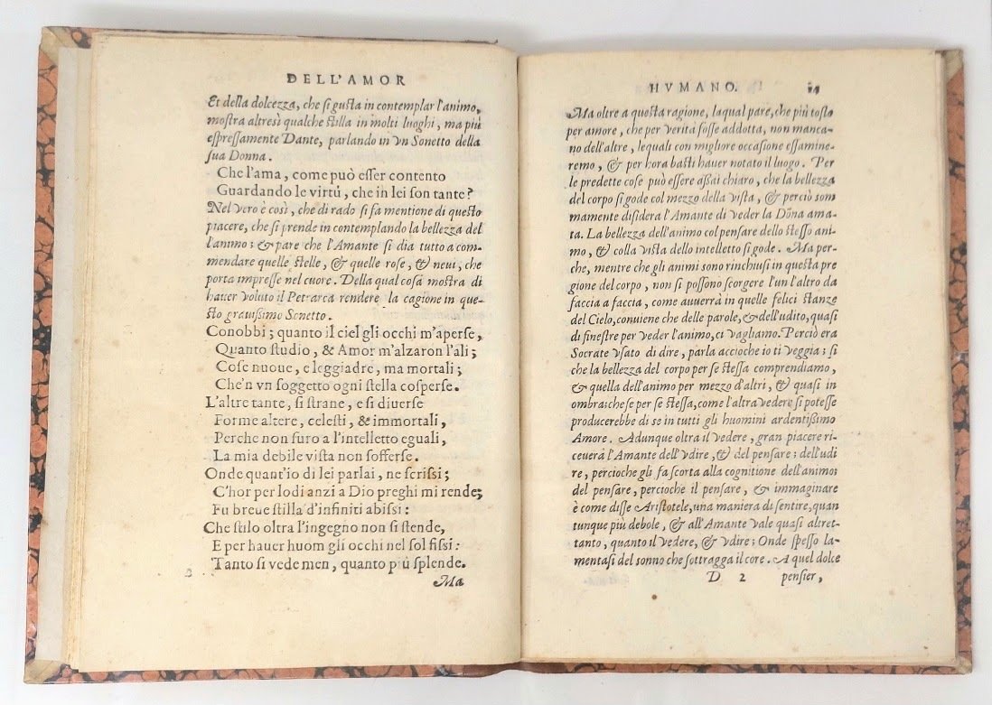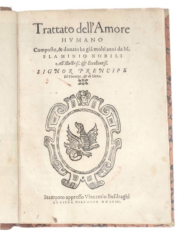 >in-8 (200x145mm), ff 57, mancante dell'ultimo foglio bianco. Impresa tipografica al frontespizio, iniziali e fregi xilografici. Legatura ottocentesca in mezza pelle, titolo oro e fregi al dorso. Variante con al titolo l'impresa editoriale del drago con volto umano entro elaborata cornice ovale (esiste una variante con stemma calcografico dei Medici). Prima edizione di questo trattato sull'amore ispirato in gran parte ai sonetti del Petrarca e alle tesi neoplatoniche di Ficino. Ebbe immediato apprezzamento da Annibal Caro, Carlo Gualteruzzi, Benedetto Varchi e Torquato Tasso. Esemplare appartenuto al bibliofilo ferrarese Giuseppe Cavalieri (1834-1918), in buone condizioni, ma piccolo foro al margine inferiore del frontespizio, alcune lievi bruniture e minime fioriture, una piccola macchia alle ultime 3 carte. Tammaro De Marinis, Catalogue des livres composant la bibliothèque de M. Giuseppe Cavalieri à Ferrara. Florence: T. De Marinis, 1908