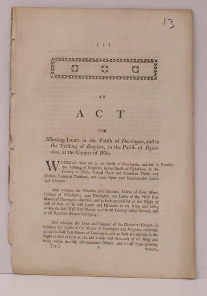 An Act for Allotting Lands in the Parish of Durrington. And in the Tything of Knighton, in the Parish of Figheldean, in the County of Wilts. FIRST SEPARATELY PUBLISHED REFERENCE TO THE PARISH