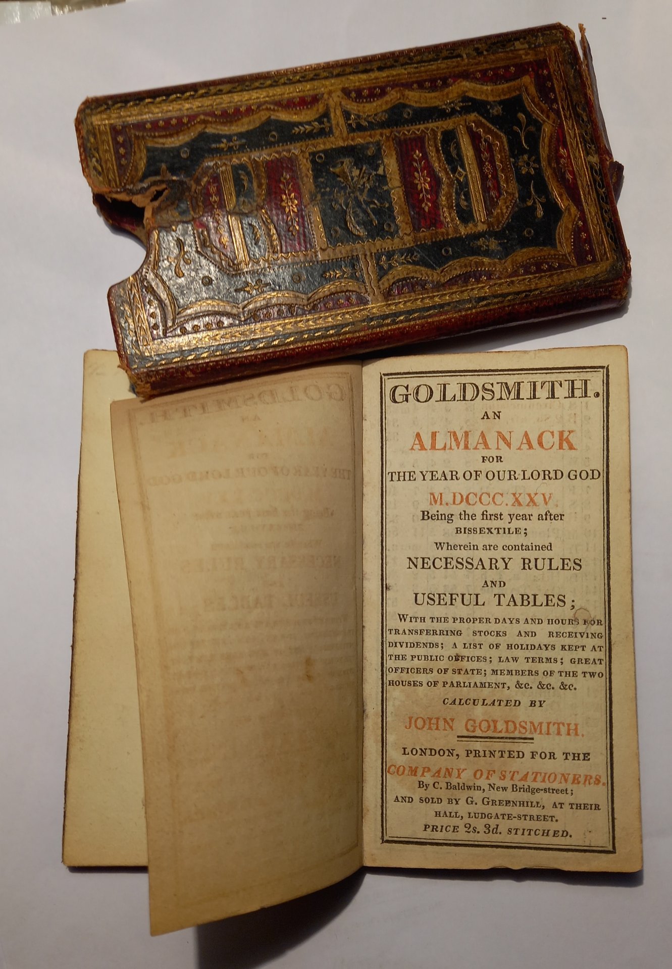 An almanack for the year of our Lord God MDCCCXXV being the first year after bissextile; wherein are contained necessary rules and usefull tables; with the proper days and hours not transferring stocks and rescriving dividends; a list of holidays kept at the public offices; law terms; great officers of state; members of the wo houses of parliament, &c &c &c. Calculated by John Goldsmith