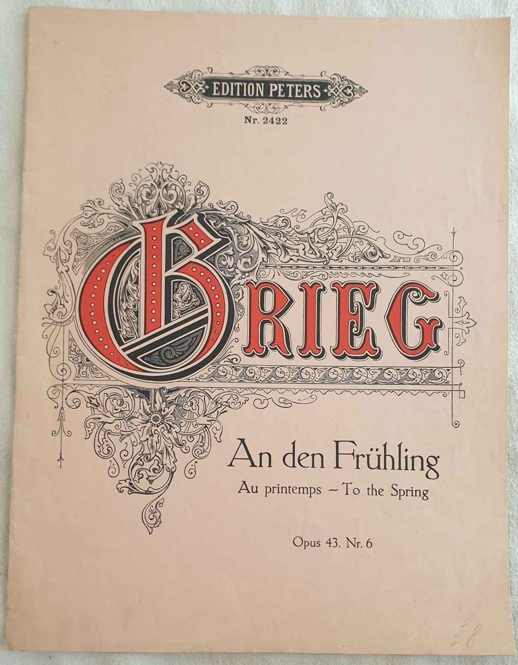 Edizione dei pirmi del novecento di questo spartito per pianoforte del compositore Edvard Grieg "To the spring" dall'opera 43 n. 6. Ottime condizioni. Legatura in buone condizioni. In 4. cm 30,5x23,5. pp. 7. Edition of early XX century of this musical score for piano by the composer Edvard Grieg "To the spring" fromt he work 43 n. 6. Very good conditions. Binding in good conditions. In 4. cm 30,5x23,5. pp. 7.
