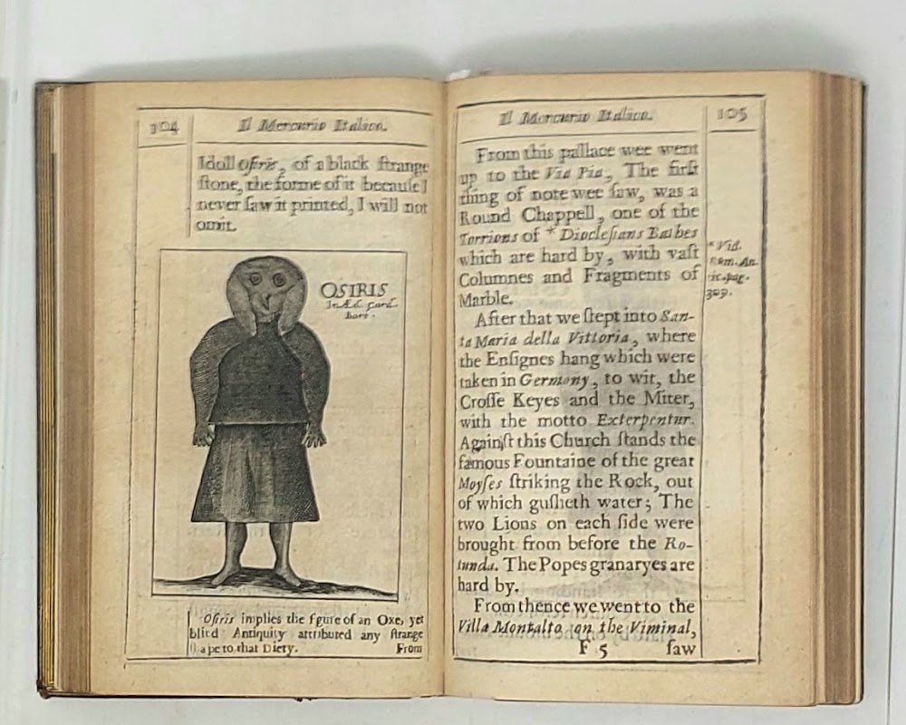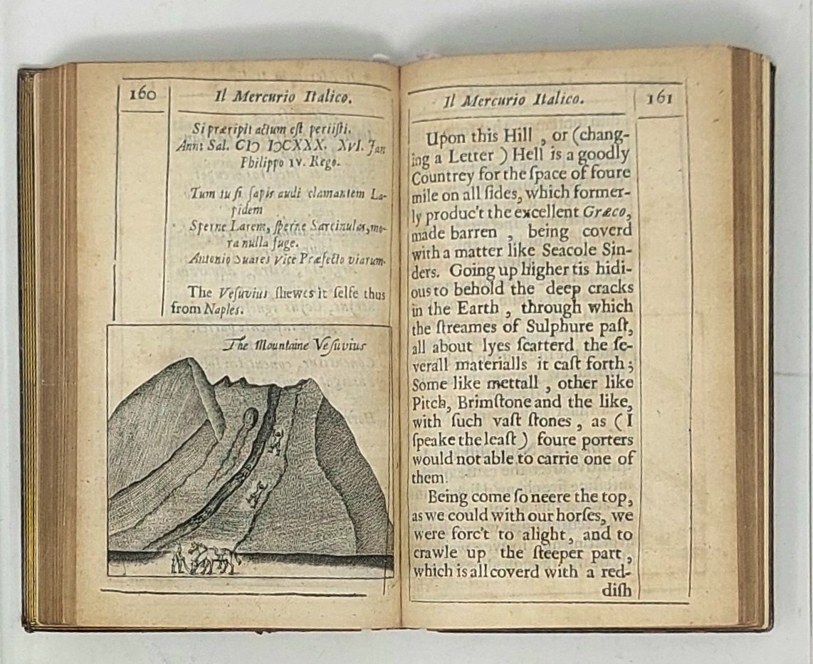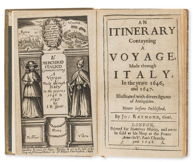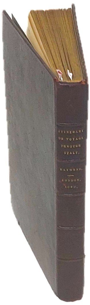 >in-12, (140x90 mm) pp. 46 nn. 284, legatura ottocentesca in piena pelle, titoli e nervi al dorso, tagli dorati. Testo riquadato da duplice filetto. L'antiporta inciso reca due vedutine di Roma e Venezia, ai lati le figure di due prelati e titolo alternativo: Il Mercurio Italico. Communicating a Voyage made through Italy in the yeares 1646 & 1647 by I.R. Gent. Altre dieci figure nel testo. Prima edizione della prima guida d'Italia realizzata da un inglese e per i viaggiatori e turisti inglesi. Benché l'autore risulti John Raymond, fu in realtà per lo più compilata da suo zio, il dottor John Bargrave: Canonico di Canterbury e bibliotecario del St. Peter's College di Cambridge, nonché noto collezionista di antichità. Gli schizzi tratti dai suoi diari di viaggio sono la fonte delle incisioni che illustrano l'opera, tra i soggetti: il Vesuvio, la tomba di Nerone, la tomba di Tully e Villa Formica e l'Arena di Verona. Dalla lettera ai lettori: "Gentlemen, Dedicatory leaves to a Book, like a Curtaine before a picture, only beget some higher expectation of the Piece; A weather beaten Traveller needs no such Umbrilla as a Patron to shroud under. Though this Booke was not writ to bee Printed, yet the worst (infallibly) are printed to be read. My intention was to confine this wanderer to my Closet and no farther; till the advice of some familiar, and command of Superiour Friends prest mee to exchange a single Manuscript for more Numerous Prints ...” Bell'esemplare, malgrado lievi bruniture nei margini delle ultime carte; alla sguardia etichetta di libraio londinese. Fossati Bellani 324. D'Ancona 679.