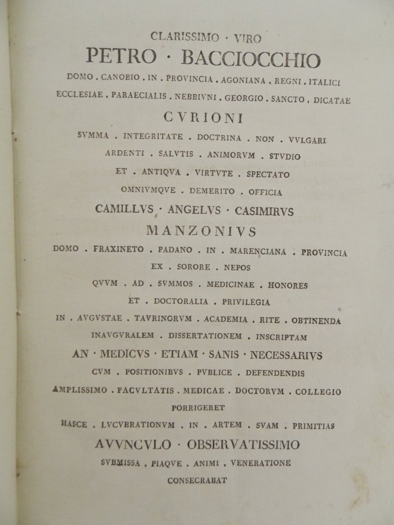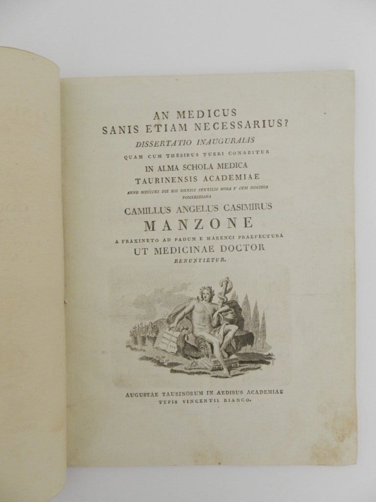 An medicus sanis etiam necessarius? Dissertatio inauguralis quam cum thesibus tueri conabitur in alma Schola Medica Taurinensis Academiae anno 1811. die 12. mensis sextilis hora 5. cum dimidio pomeridiana Camillus Angelus Casimirus Manzone a Fraxineto ad Padum e Marenci praefectura ut medicinae doctor renuntietur