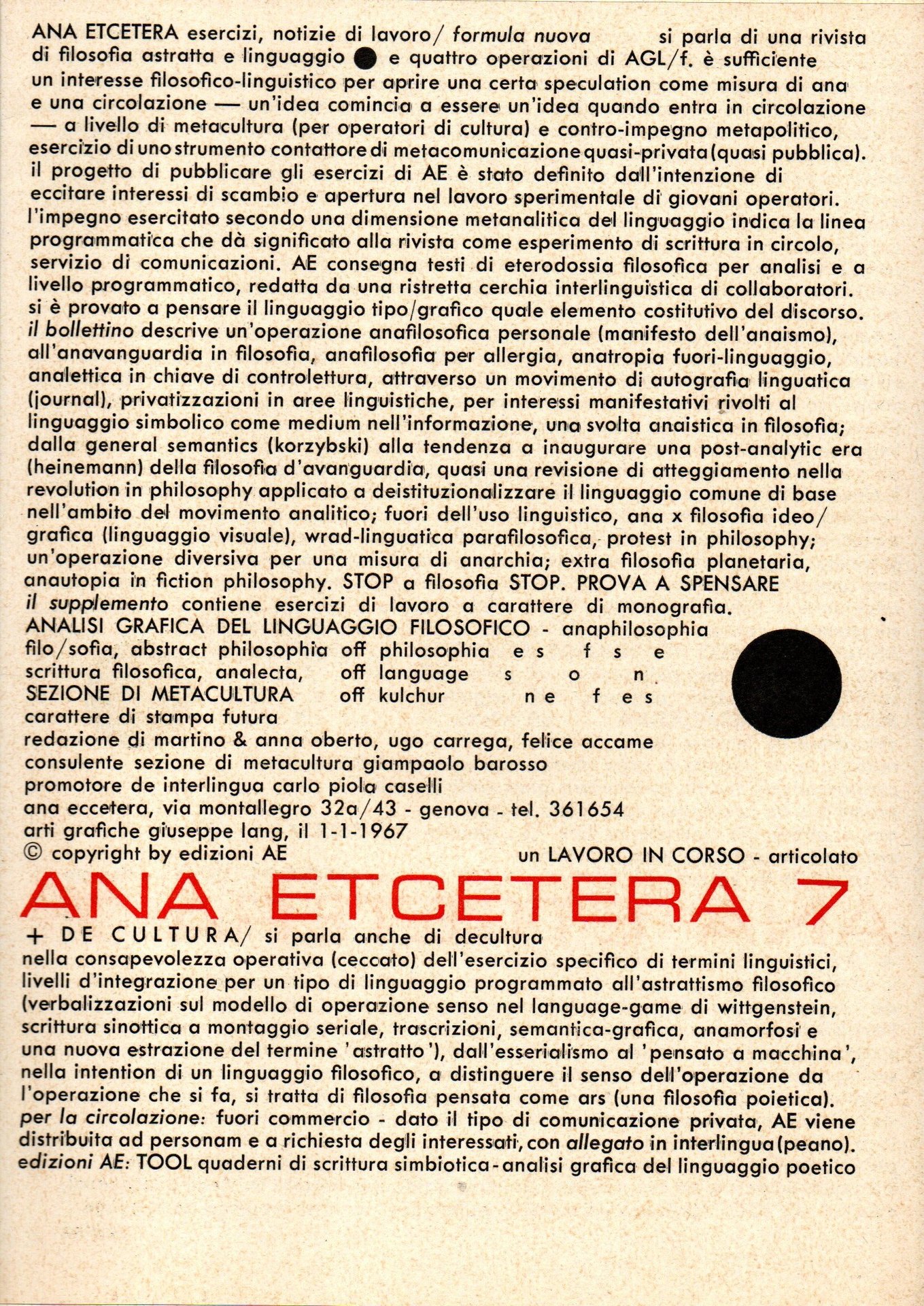 Cartella editoriale con acetato, titoli al piatto e al dorso in nero e rosso, contiene 3 fascicoli e 8 fogli sciolti, testo impaginato irregolarmente con incursioni grafiche di poesia visuale, illustrazioni in b/n riproducono disegni, opere anche a piena pagina e testi calligrafati a stampa. Contenuti dal sommario: "OM. Anaphilosophia (scheda)", "Ana x filosofia ideografica (filosofia visuale)", "AGL/filosofico (una ars philosophica)", "AGL/f-poietico", "F/ filo/sofia della barra", "Journal Anaphilosophicus, una filosofia poietica", "Off Language (in project), prova a spensare" e "Metapolitica zu Kulchur (anavanguardia in filosofia)" di Martino Oberto; "Poietica (appunti per un corso pratico di scrittura simbiotica)" di Ugo Carrega; "Metacomunicazione" di Anna Oberto; "Un'operazione diversiva" e "Un'esercitazione di operazionismo culturale" di Felice Accame; "Brevi appunti su alcune ipotesi teoretiche per una rivincita metodologica dell'analisi critica da un punto di vista deculturale" e "Immodificabilità futurativa (saggio sul fare scrivente)" di Giampaolo Barosso; "De Civiologia", "Logico linguistico" e "Regulas et notiones de Interlingua" di Carlo Piola Caselli; il "Supplemento Decultura" con testi di Felice Accame, Giampaolo Barosso, Vittoria Giuliani e Gabriella Zarri. Rivista dell'avanguardia genovese di poesia visuale, con periodicità irregolare, distribuita privatamente, fondata nel 1958 dai coniugi Anna Oberto e Martino Oberto insieme a Gabriele Stocchi. Cambia titolo tre volte: "Ana Eccetera" dal '58 al '61, "Ana Etcetera" dal '63 al '69 e "Ana Excetera" dal '70 al '71. Conserva la fascetta editoriale che recita "Una rivista off", in stato di nuovo.