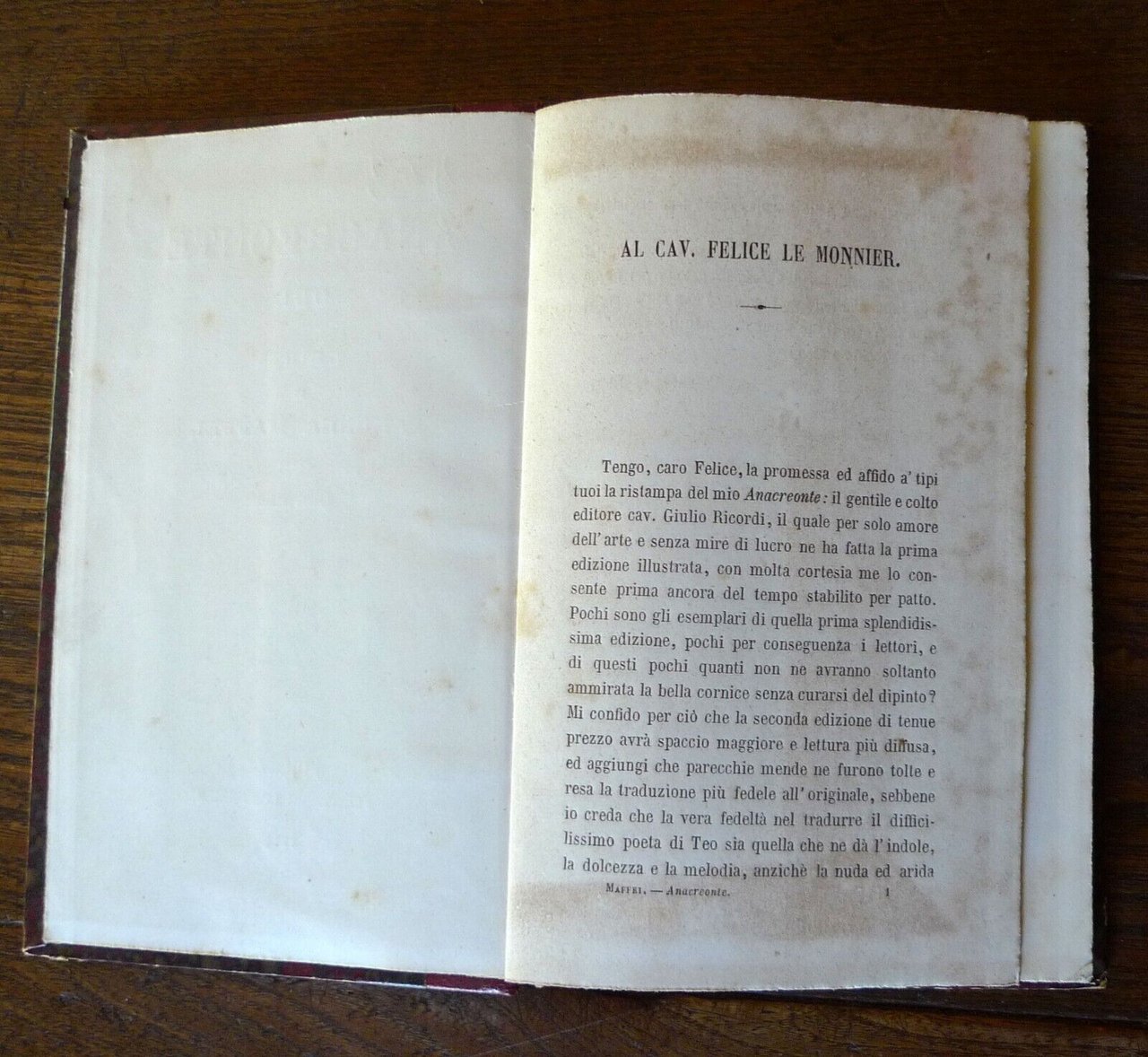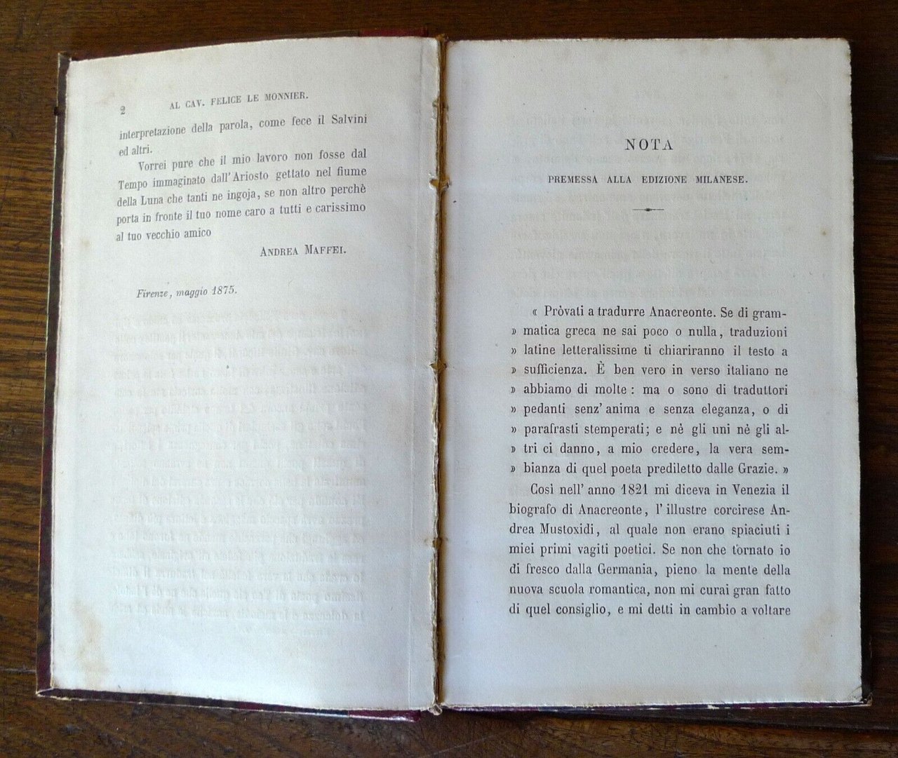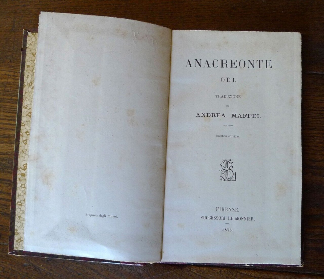 ANACREONTE,ODI.TRADUZIONE DI ANDREA MAFFEI.SECONDA EDIZIONE.FIRENZE, SUCCESSORI LE MONNIER, 1875,copertina rigida, rilegatura coeva in mezza pelle,19x12 cm., pp.116,peso: g.250