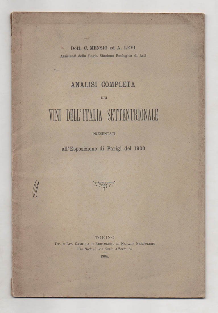 LIBROPrima edizione.Lievi bruniture, ma ottimo esemplare. Timbro di prestigiosa collezione privata.Saggio sui vini. Estratto dal volume 47 degli «Annali della Reale Accademia d'agricoltura di Torino», adunanza del 1 maggio 1904. Molto raro.
