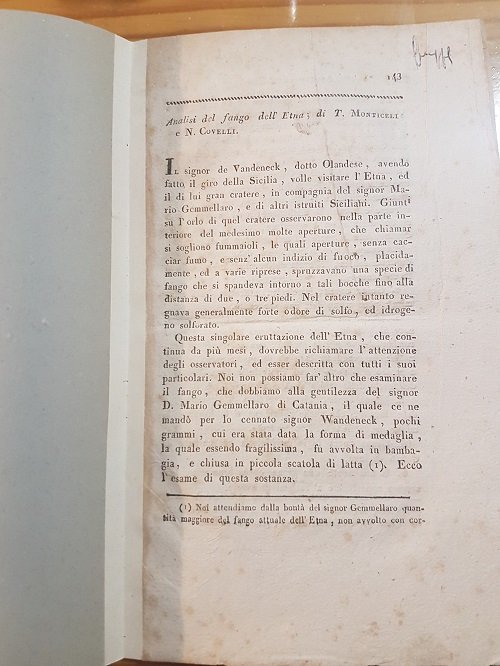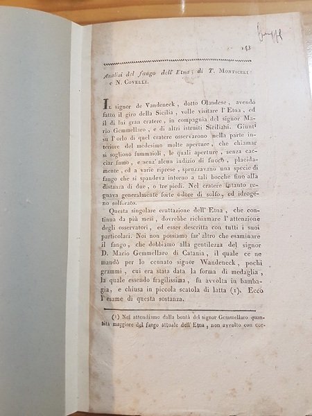 PICCOLO ESTRATTO SULL'ARGOMENTO, PROBABILMENTE PRESO DA QUALCHE VOLUME DELL'800 E BROSSURATO SU CARTONCINO, LA DATA SI INTUISCE DAL TIPO DI CARTA UTILIZZATA. E' UN ANALISI DELLE LAVE DELL'ETNA ESEGUITA DAI 2 AUTORI, INVIATA DAL FAMOSO MARIO GEMMELLARO. CON PARAGONI SULLE ERUZIONI AVVENUTE IN MACALUBA E MACALUBETTA DEL 1777